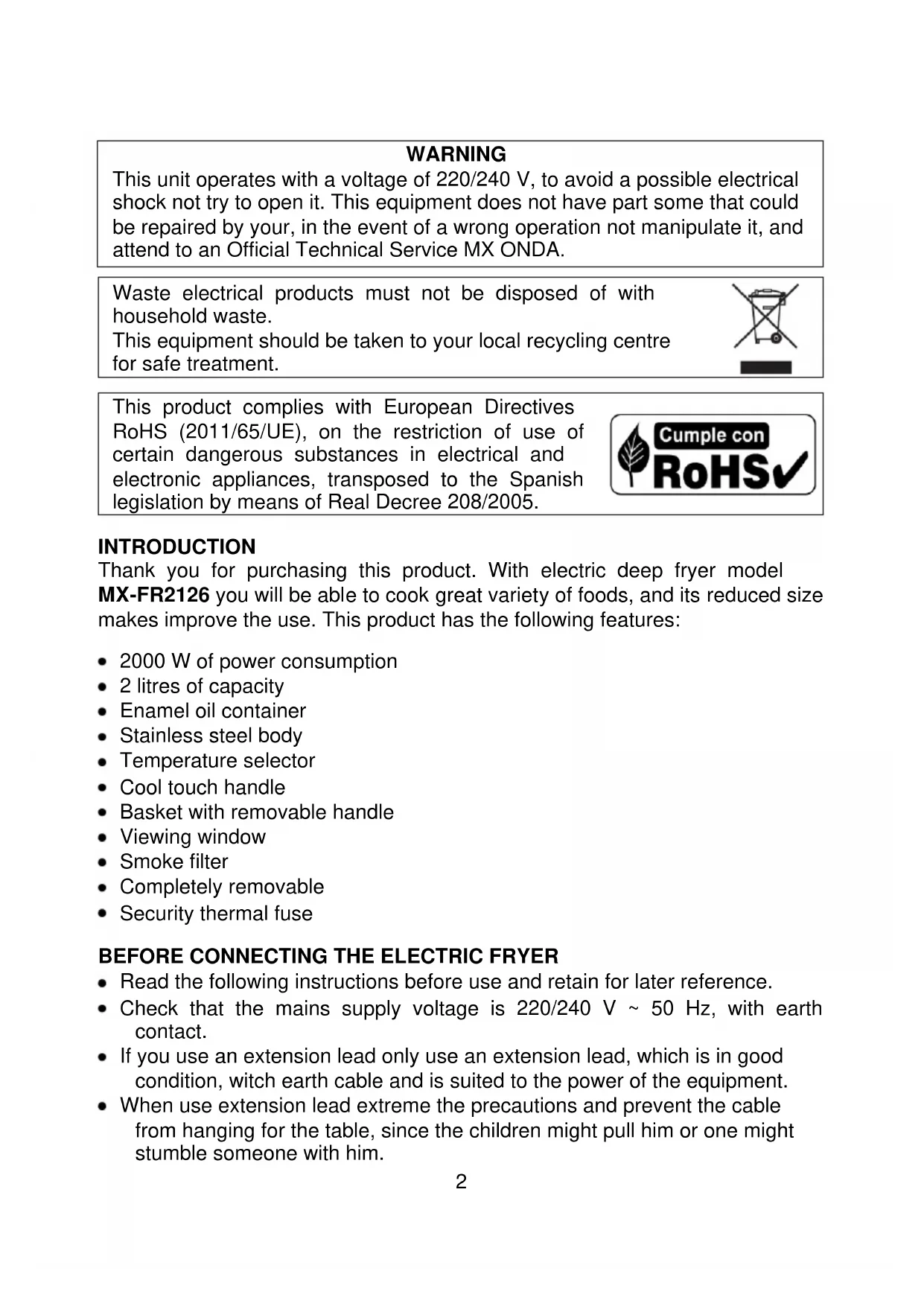 Thank you for purchasing this product. With electric deep fryer model MX-FR2126 you will be able to cook great variety of foods, and its reduced size makes improve the use. This product has the following features:
