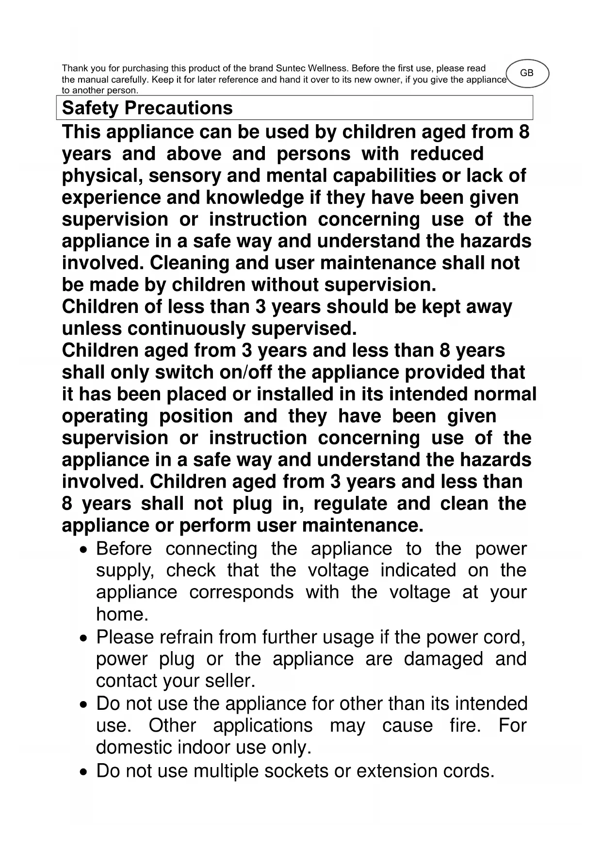 CoolBreeze SUNTEC WELLNESS GMBH / HOLZSTRASSE 2 / 40 221 DÜSSELDORF / DEUTSCHLANDThank you for purchasing this product of the brand Suntec Wellness. Before the first use, please read the manual carefully. Keep it for later reference and hand it over to its new owner, if you give the appliance to another person. Safety Precautions This appliance can be used by children aged from 8 years and above and persons with reduced physical, sensory and mental capabilities or lack of experience and knowledge if they have been given supervision or instruction concerning use of the appliance in a safe way and understand the hazards involved. Cleaning and user maintenance shall not be made by children without supervision. Children of less than 3 years should be kept away unless continuously supervised. Children aged from 3 years and less than 8 years shall only switch on/off the appliance provided that it has been placed or installed in its intended normal operating position and they have been given supervision or instruction concerning use of the appliance in a safe way and understand the hazards involved. Children aged from 3 years and less than 8 years shall not plug in, regulate and clean the appliance or perform user maintenance.