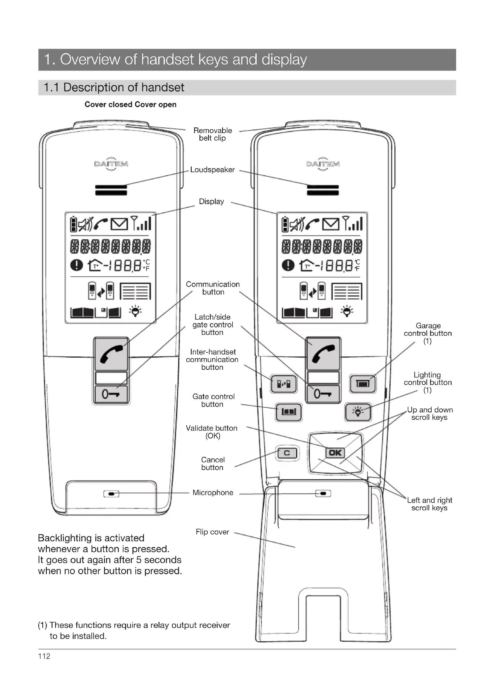 Cover closed Cover open Removable belt clip Loudspeaker Display Communication button Flip cover Microphone Cancel button Validate button (OK) Gate control button Inter-handset communication button Latch/side gate control button Garage control button (1) Lighting control button (1) Up and down scroll keys Left and right scroll keys Backlighting is activated whenever a button is pressed. It goes out again after 5 seconds when no other button is pressed. (1) These functions require a relay output receiver to be installed.113