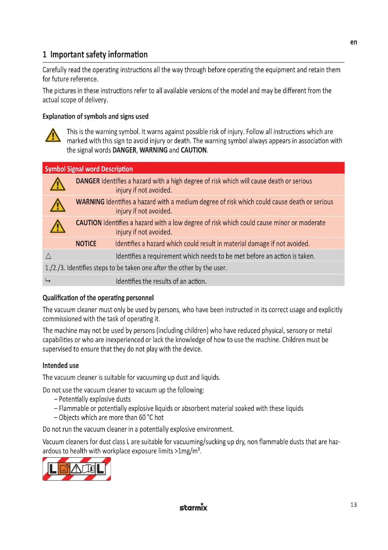 Vacuum cleaners which are not identified as being suitable for dust class L are only suitable for vacuuming/ sucking up non-hazardous to health dusts.