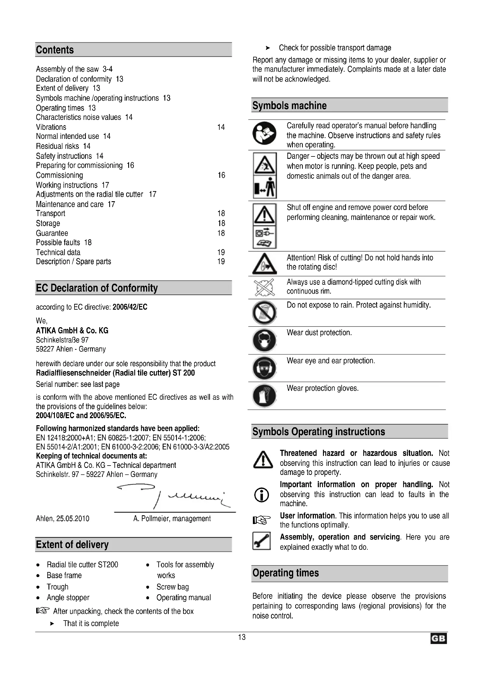 EC Declaration of Conformity according to EC directive: 2006/42/EC We, ATIKA GmbH & Co. KG Schinkelstraße 97 59227 Ahlen - Germany herewith declare under our sole responsibility that the product Radialfliesenschneider (Radial tile cutter) ST 200 Serial number: see last page is conform with the above mentioned EC directives as well as with the provisions of the guidelines below: 2004/108/EC and 2006/95/EC. Following harmonized standards have been applied: EN 12418:2000+A1; EN 60825-1:2007; EN 55014-1:2006; EN 55014-2/A1:2001; EN 61000-3-2:2006; EN 61000-3-3/A2:2005 Keeping of technical documents at: ATIKA GmbH & Co. KG – Technical department Schinkelstr. 97 – 59227 Ahlen – Germany