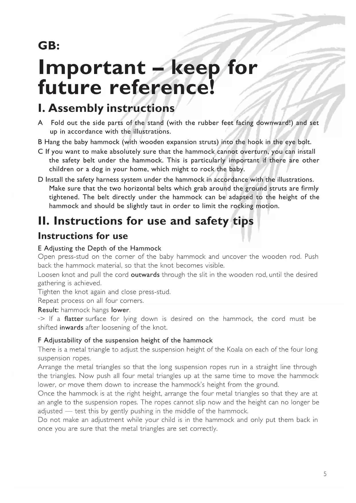 A Fold out the side parts of the stand (with the rubber feet facing downward!) and set up in accordance with the illustrations. B Hang the baby hammock (with wooden expansion struts) into the hook in the eye bolt. C If you want to make absolutely sure that the hammock cannot overturn, you can install the safety belt under the hammock. This is particularly important if there are other children or a dog in your home, which might to rock the baby. D Install the safety harness system under the hammock in accordance with the illustrations. Make sure that the two horizontal belts which grab around the ground struts are firmly tightened. The belt directly under the hammock can be adapted to the height of the hammock and should be slightly taut in order to limit the rocking motion.