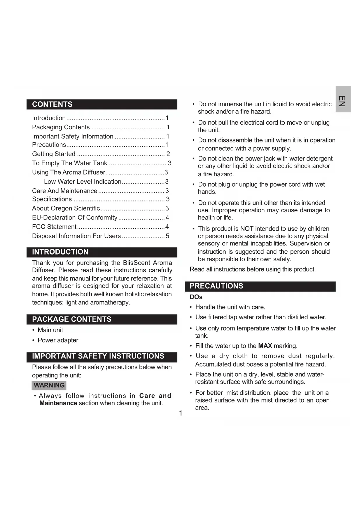 Hereby, Oregon Scientific, declares that this BlisScent Aroma Diffuser (model: WA633) is in compliance with EMC directive 2004/108/EC and LVD directive 2006/95/EC. A copy of the signed and dated Declaration of Conformity is available on request via our Oregon Scientic Customer Service. FCC STATEMENT This device complies with Part 15 of the FCC Rules. Operation is subject to the following two conditions: (1) This device may not cause harmful interference, and (2) This device must accept any interference received, including interference that may cause undesired operation. WARNING Changes or modifications not expressly approved by the party responsible for compliance could void the user's authority to operate the equipment. NOTE This equipment has been tested and found to comply with the limits for a Class B digital device, pursuant to Part 15 of the FCC Rules. These limits are designed to provide reasonable protection against harmful interference in a residential installation.This equipment generates, uses and can radiate radio frequency energy and, if not installed and used in accordance with the instructions, may cause harmful interference to radio communications. However, there is no guarantee that interference will not occur in a particular installation. If this equipment does cause harmful interference to radio or television reception, which can be determined by turning the equipment off and on, the user is encouraged to try to correct the interference by one or more of the following measures:• Reorient or relocate the receiving antenna.• Increase the separation between the equipment and receiver.• Connect the equipment into an outlet on a circuit different from that to which the receiver is connected.• Consult the dealer or an experienced radio/TV technician for help.This Class B digital apparatus complies with Canadian ICES- 3(B)/NMB-3(B)