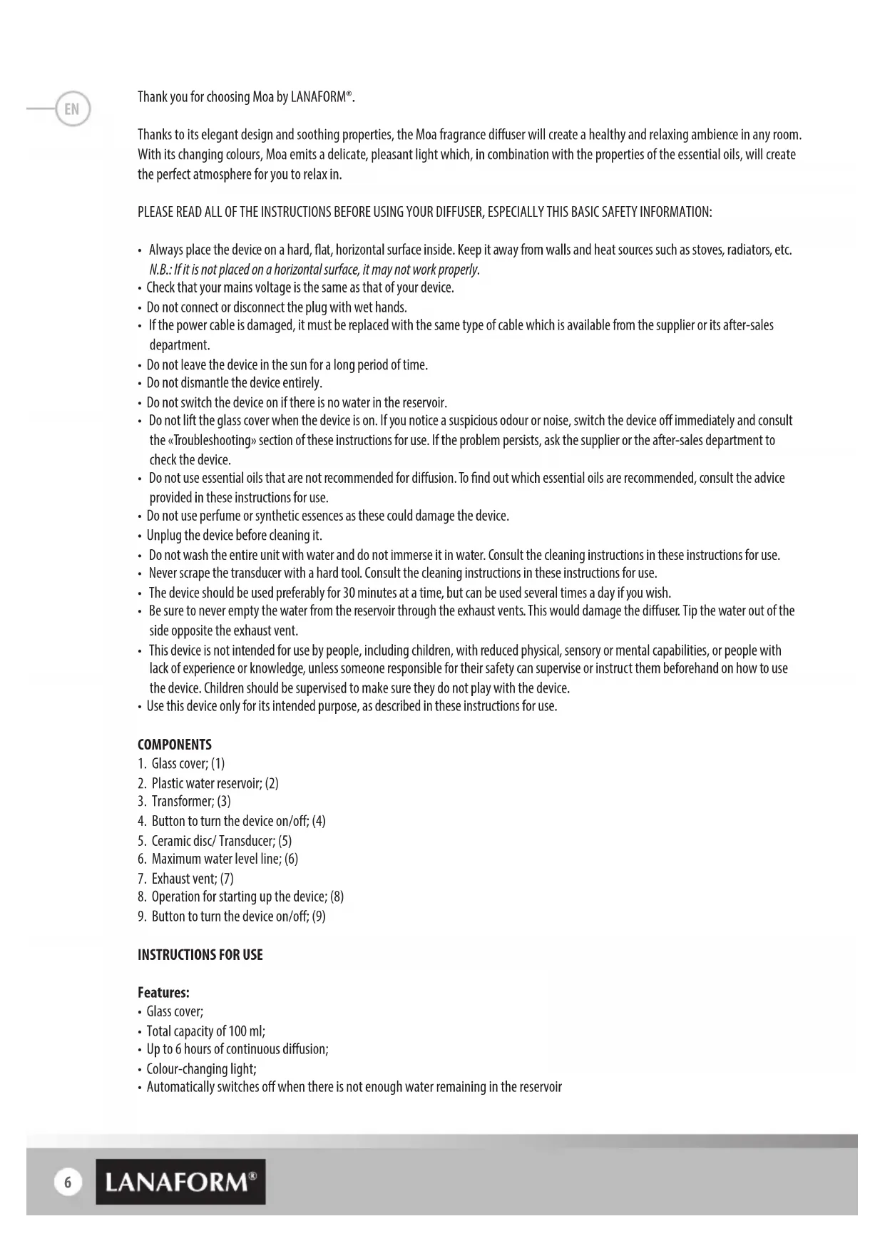 - When you have nished using the device, please dispose of it in an environmentally friendly way and in accordance with the law. LIMITED WARRANTY LANAFORM® guarantees this product against any material or manufacturing defect for a period of two years from the date of purchase, except in the circumstances described below. The LANAFORM® guarantee does not cover damage caused as a result of normal wear to this product. In addition, the guarantee covering this LANAFORM® product does not cover damage caused by abusive or inappropriate or incorrect use, accidents, the use of unauthorized accessories, changes made to the product or any other circumstance, of whatever sort, that is outside LANAFORM®’s control. LANAFORM® may not be held liable for any type of circumstantial, indirect or specic damage. All implicit guarantees relating to the suitability of the product are limited to a period of two years from the initial date of purchase as long as a copy of the proof of purchase can be supplied. On receipt, LANAFORM® will repair or replace your appliance at its discretion and will return it to you. The guarantee is only valid through LANAFORM®’s Service Centre®. Any attempt to maintain this product by a person other than LANAFORM®’s Service Centre will render this guarantee void. EN10 Nous vous remercions d’avoir acheté le « Moa » de LANAFORM®. Avec son design élégant et apaisant, le diuseur d’arômes « Moa » crée une ambiance saine et relaxante dans votre intérieur. Grâce à ses changements de couleurs, « Moa» génère une lumière délicate et agréable, qui, s’associant aux vertus des huiles essentielles vous fourniront une atmosphère parfaite pour vous décontracter. VEUILLEZ LIRE TOUTES LES INSTRUCTIONS AVANT D’UTILISER VOTRE DIFFUSEUR, EN PARTICULIER CES QUELQUES CONSIGNES DE SECURITE FONDAMENTALES :