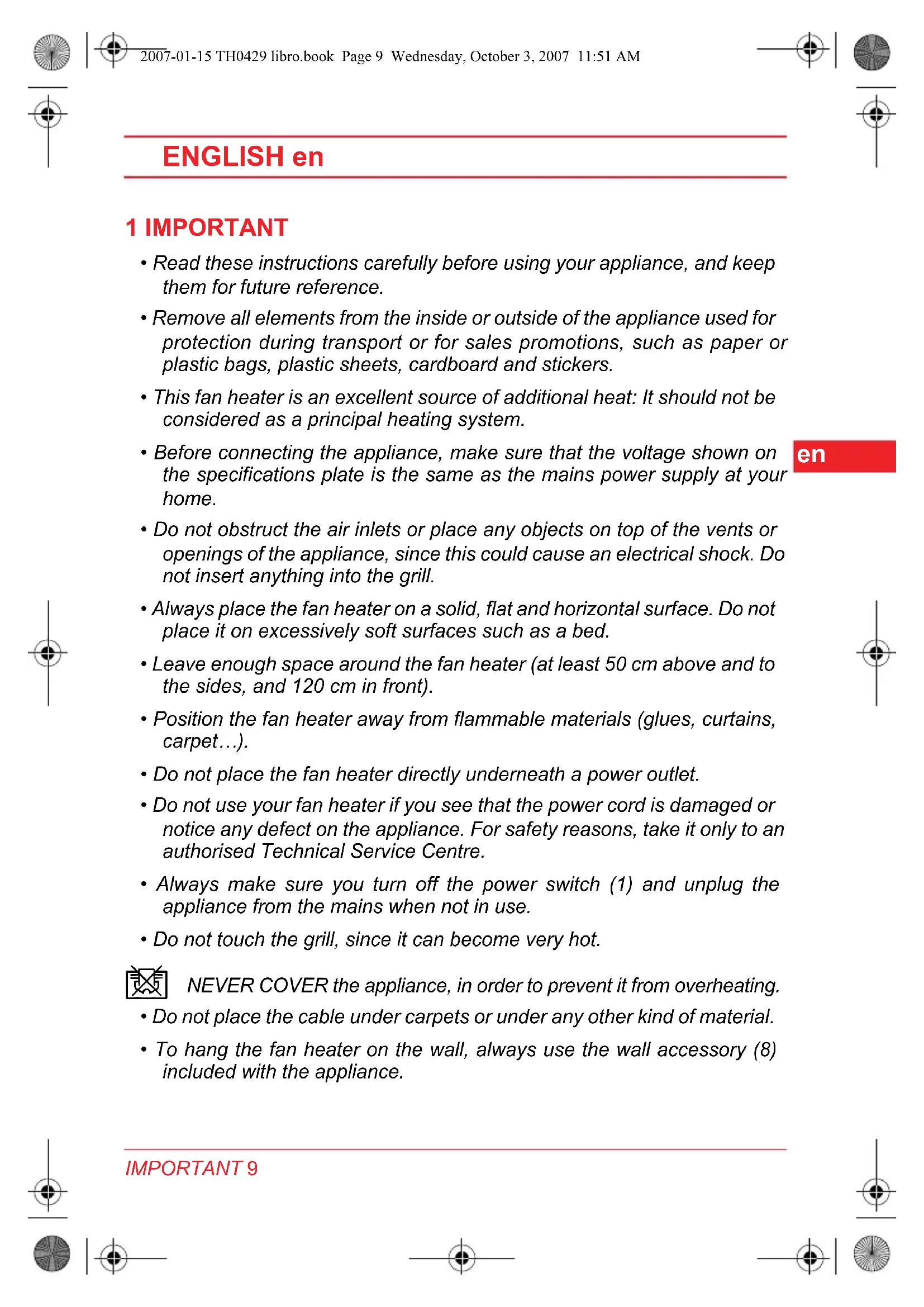 - Do not use the fan heater to dry clothes, do not leave furniture closer than 50~cm in front of the appliance, and do not use it in rooms with less than 4m^2 of floor space.