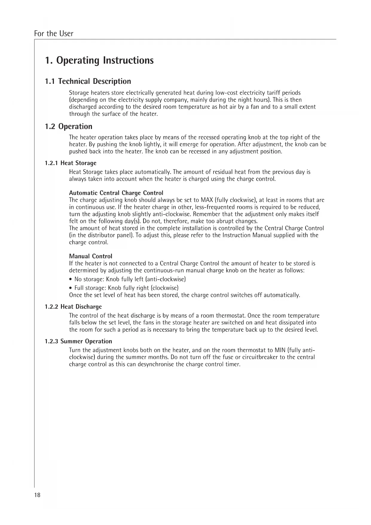 - Use an automatic charge control to charge the heater if possible. Then, the heater will only store the amount of heat necessary to cover the heat load for the following day. A correctly adjusted charge control is a prerequisite for an economic operation of the storage heater at comfortable room temperatures.