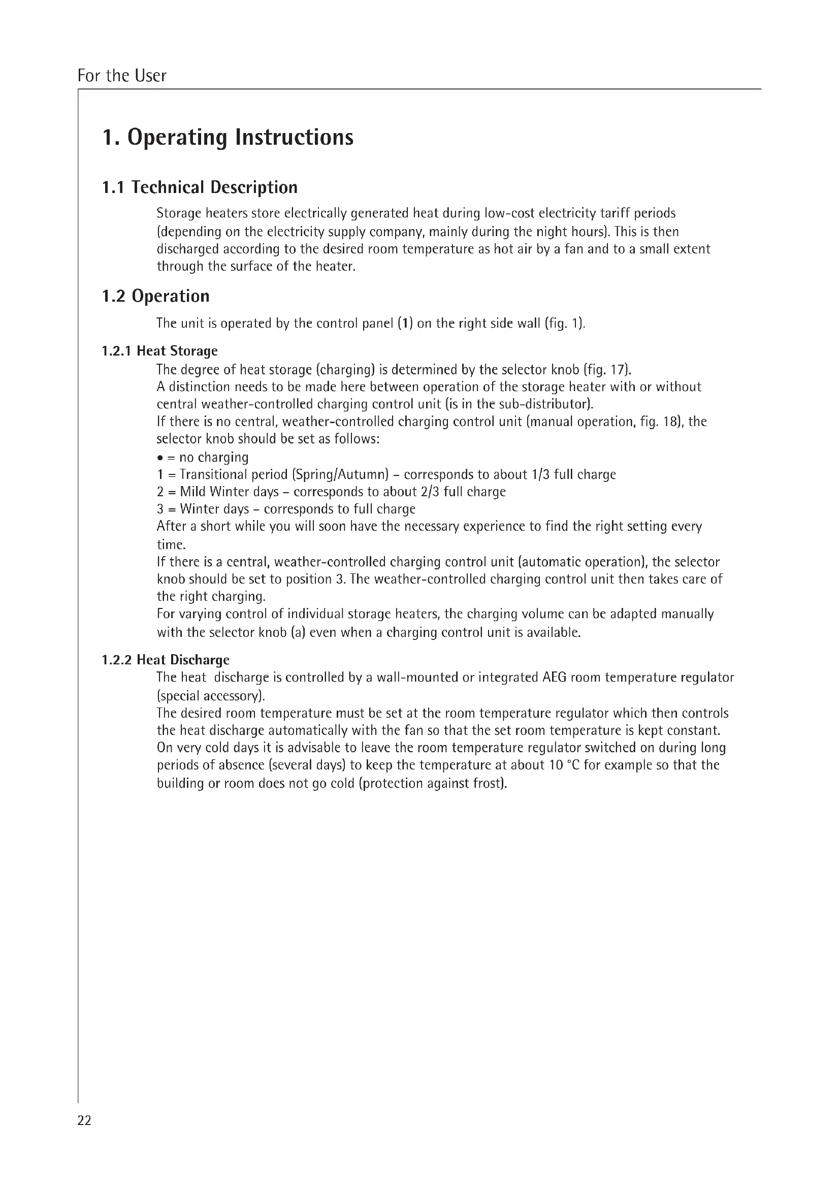 A distinction needs to be made here between operation of the storage heater with or without central weather-controlled charging control unit (is in the sub-distributor).