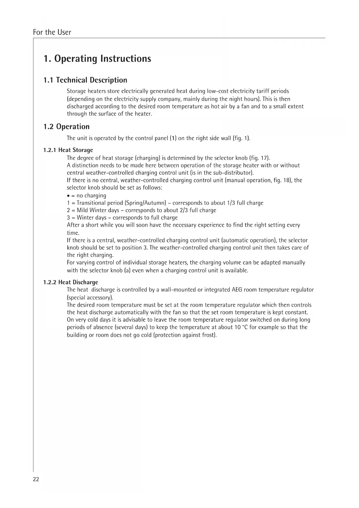 The heat discharge is controlled by a wall-mounted or integrated AEG room temperature regulator (special accessory). The desired room temperature must be set at the room temperature regulator which then controls the heat discharge automatically with the fan so that the set room temperature is kept constant. On very cold days it is advisable to leave the room temperature regulator switched on during long periods of absence (several days) to keep the temperature at about 10 °C for example so that the building or room does not go cold (protection against frost). For the User23 English