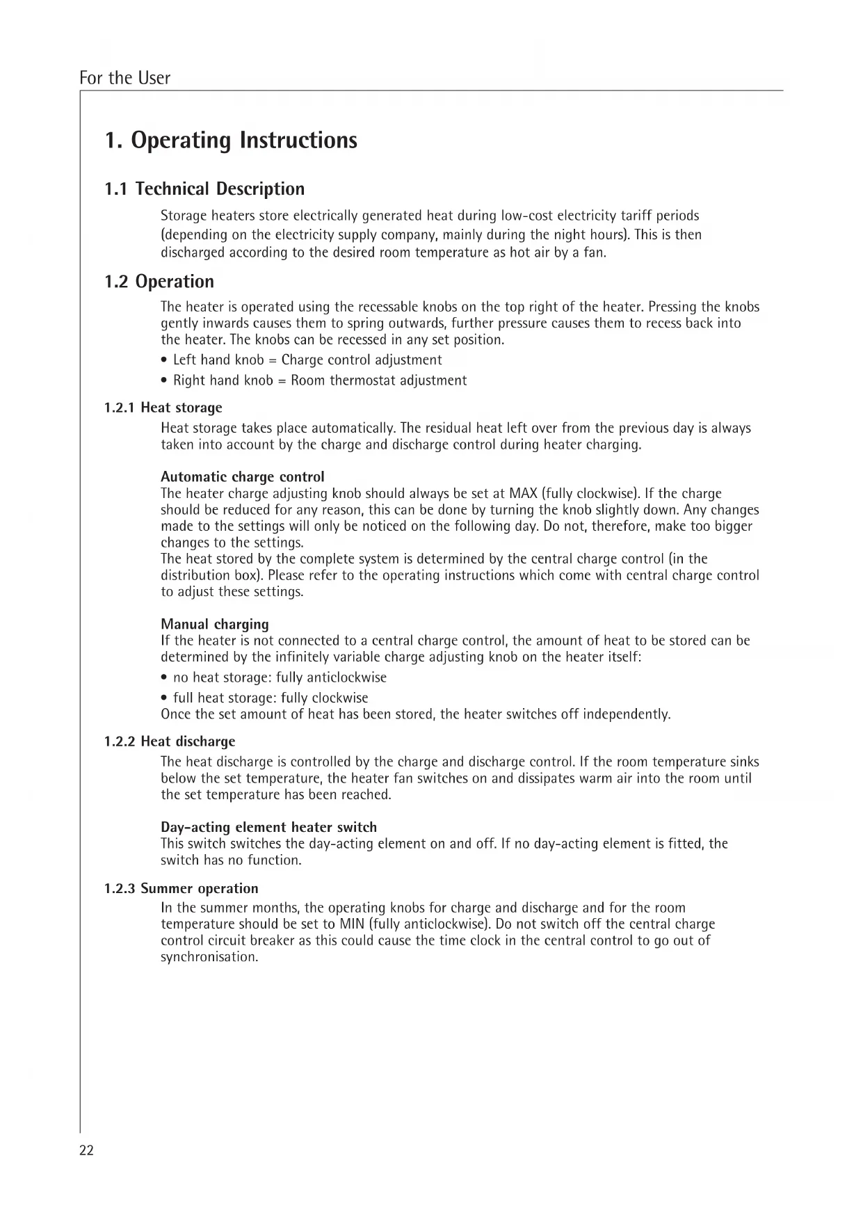 In the summer months, the operating knobs for charge and discharge and for the room temperature should be set to MIN (fully anticlockwise). Do not switch off the central charge control circuit breaker as this could cause the time clock in the central control to go out of synchronisation.23 For the User