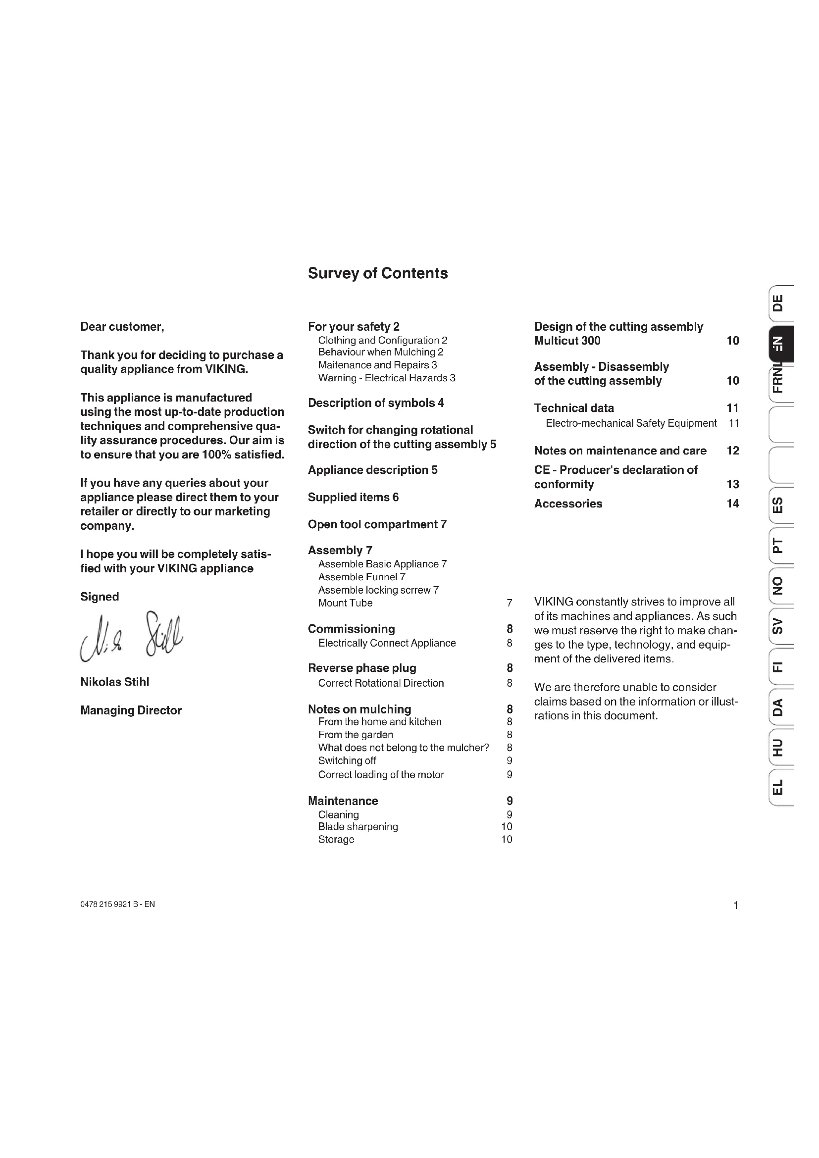 Dear customer, Thank you for deciding to purchase a quality appliance from VIKING. This appliance is manufactured using the most up-to-date production techniques and comprehensive qua- lity assurance procedures. Our aim is to ensure that you are 100% satisfied. If you have any queries about your appliance please direct them to your retailer or directly to our marketing company. I hope you will be completely satis- fied with your VIKING appliance Signed Nikolas Stihl Managing Director Survey of Contents VIKING constantly strives to improve all of its machines and appliances. As such we must reserve the right to make chan- ges to the type, technology, and equip- ment of the delivered items. We are therefore unable to consider claims based on the information or illust- rations in this document.