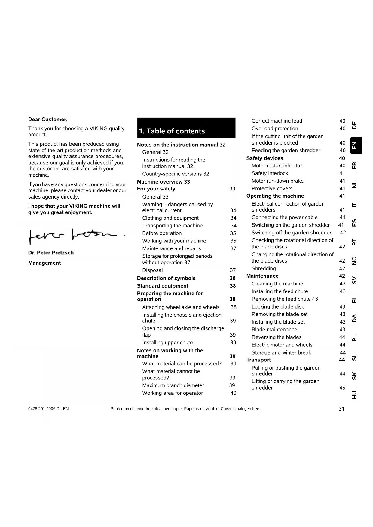 Notes on the instruction manual 32 General 32 Instructions for reading the instruction manual 32 Country-specific versions 32 Machine overview 33 For your safety 33 General 33 Warning – dangers caused by electrical current 34 Clothing and equipment 34 Transporting the machine 34 Before operation 35 Working with your machine 35 Maintenance and repairs 37 Storage for prolonged periods without operation 37 Disposal 37 Description of symbols 38 Standard equipment 38 Preparing the machine for operation 38 Attaching wheel axle and wheels 38 Installing the chassis and ejection chute 39 Opening and closing the discharge flap 39 Installing upper chute 39 Notes on working with the machine 39 What material can be processed? 39 What material cannot be processed? 39 Maximum branch diameter 39 Working area for operator 40 Correct machine load 40 Overload protection 40 If the cutting unit of the garden shredder is blocked 40 Feeding the garden shredder 40 Safety devices 40 Motor restart inhibitor 40 Safety interlock 41 Motor run-down brake 41 Protective covers 41 Operating the machine 41 Electrical connection of garden shredders 41 Connecting the power cable 41 Switching on the garden shredder 41 Switching off the garden shredder 42 Checking the rotational direction of the blade discs 42 Changing the rotational direction of the blade discs 42 Shredding 42 Maintenance 42 Cleaning the machine 42 Installing the feed chute 43 Removing the feed chute 43 Locking the blade disc 43 Removing the blade set 43 Installing the blade set 43 Blade maintenance 43 Reversing the blades 44 Electric motor and wheels 44 Storage and winter break 44 Transport 44 Pulling or pushing the garden shredder 44 Lifting or carrying the garden shredder 450478 201 9906 D - EN