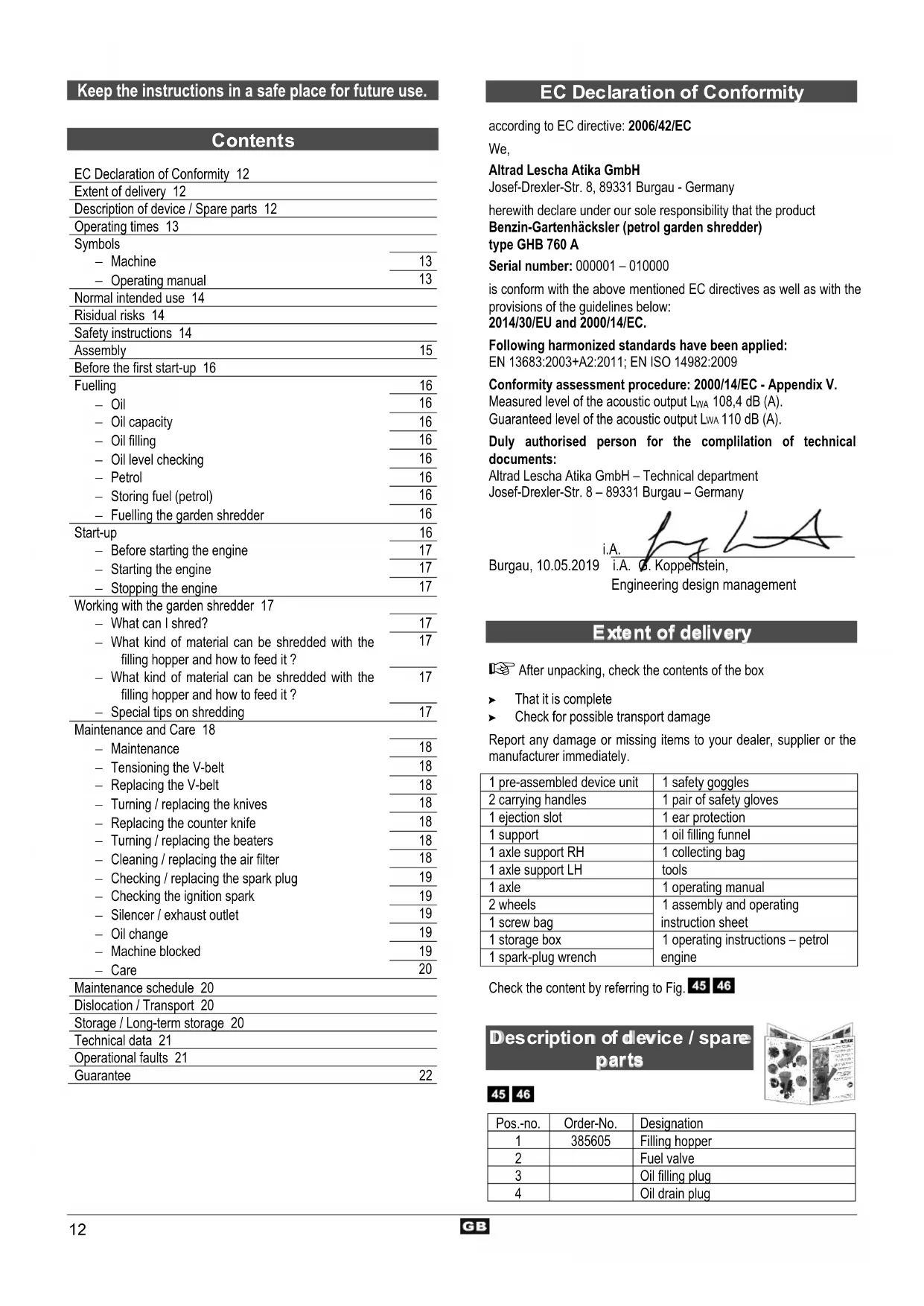 according to EC directive: 2006/42/EC We, Altrad Lescha Atika GmbH Josef-Drexler-Str. 8, 89331 Burgau - Germany herewith declare under our sole responsibility that the product Benzin-Gartenhäcksler (petrol garden shredder) type GHB 760 A Serial number: 000001 – 010000 is conform with the above mentioned EC directives as well as with the provisions of the guidelines below: 2014/30/EU and 2000/14/EC. Following harmonized standards have been applied: