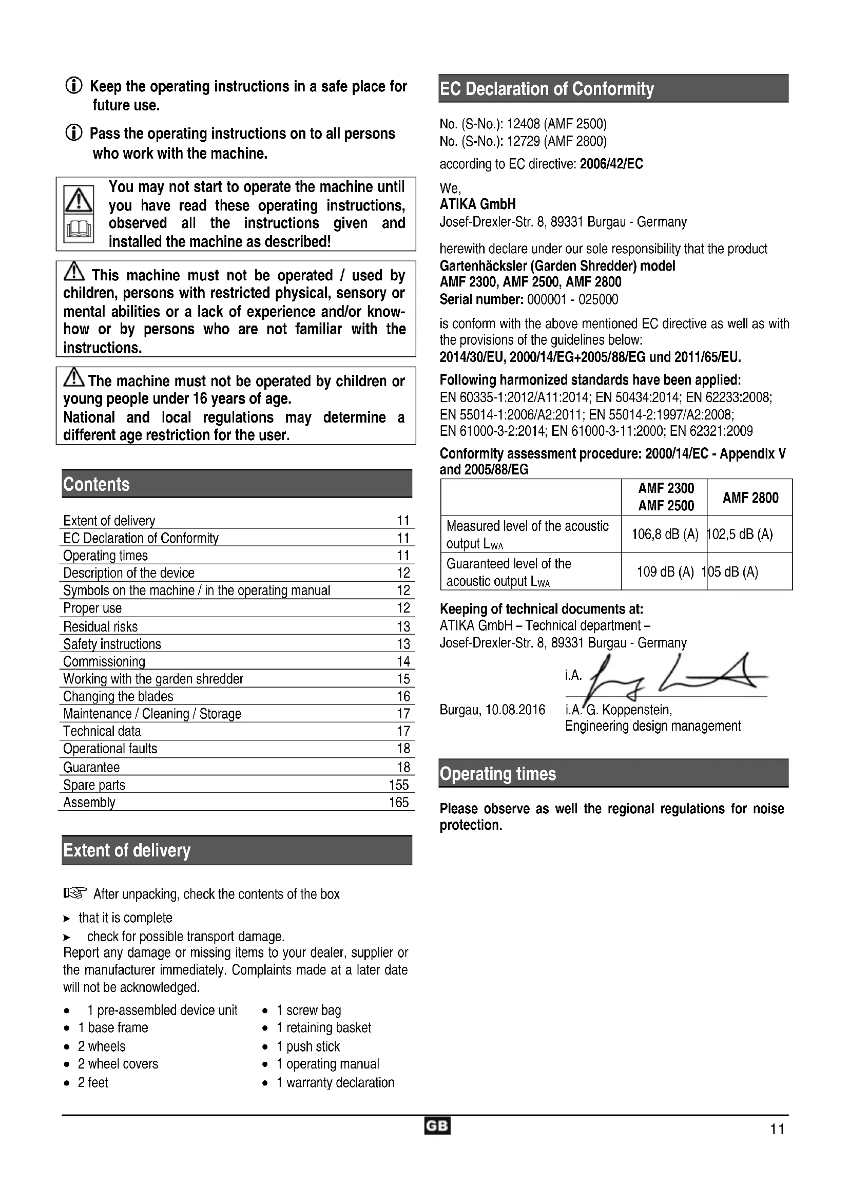 EC Declaration of Conformity No. (S-No.): 12408 (AMF 2500) No. (S-No.): 12729 (AMF 2800) according to EC directive: 2006/42/EC We, ATIKA GmbH Josef-Drexler-Str. 8, 89331 Burgau - Germany herewith declare under our sole responsibility that the product Gartenhäcksler (Garden Shredder) model
