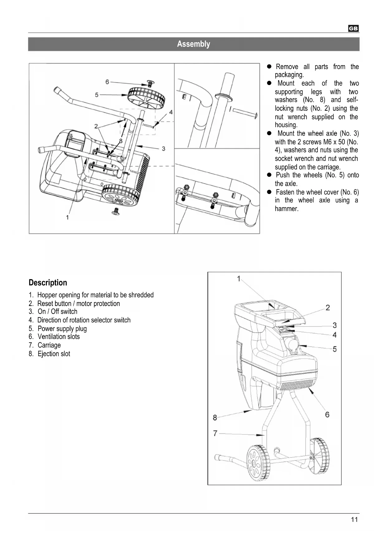 Garantie Bitte beachten Sie die beiliegende Garantieerklärung.11 Assembly Remove all parts from the packaging. Mount each of the two supporting legs with two washers (No. 8) and self- locking nuts (No. 2) using the nut wrench supplied on the housing. Mount the wheel axle (No. 3) with the 2 screws M6 x 50 (No. 4), washers and nuts using the socket wrench and nut wrench supplied on the carriage. Push the wheels (No. 5) onto the axle. Fasten the wheel cover (No. 6) in the wheel axle using a hammer.