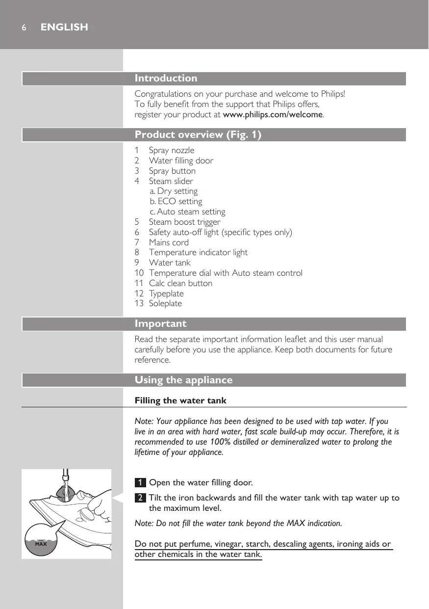GC3800 series Introduction Congratulations on your purchase and welcome to Philips! To fully benefit from the support that Philips offers, register your product at www.philips.com/welcome. Spray nozzle Water filling door Spray button Steam slider a. Dry setting b. ECO setting c. Auto steam setting Steam boost trigger Safety auto-off light (specific types only) Mains cord Temperature indicator light Water tank Temperature dial with Auto steam control Calc clean button Typeplate Soleplate Important Read the separate important information leaflet and this user manual carefully before you use the appliance. Keep both documents for future reference. Using the appliance Filling the water tank Note: Your appliance has been designed to be used with tap water. If you live in an area with hard water, fast scale build-up may occur. Therefore, it is recommended to use 100% distilled or demineralized water to prolong the lifetime of your appliance. 1 Open the water filling door. 2 Tilt the iron backwards and fill the water tank with tap water up to the maximum level. Note: Do not fill the water tank beyond the MAX indication. Do not put perfume, vinegar, starch, descaling agents, ironing aids or other chemicals in the water tank. English 3 Close the water filling door ( ‘click’). Temperature and steam setting Table 1: