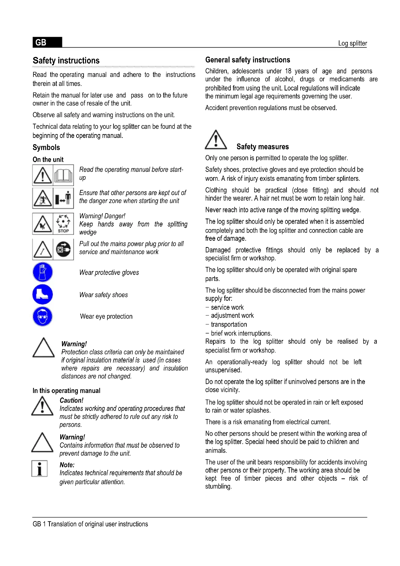 Ensure that other persons are kept out of the danger zone when starting the unit Warning! Danger! Keep hands away from the splitting wedge Pull out the mains power plug prior to all service and maintenance work Wear protective gloves Wear safety shoes Wear eye protection Warning! Protection class criteria can only be maintained if original insulation material is used (in cases where repairs are necessary) and insulation distances are not changed. In this operating manual Caution! Indicates working and operating procedures that must be strictly adhered to rule out any risk to persons. Warning! Contains information that must be observed to prevent damage to the unit. Note: Indicates technical requirements that should be given particular attention. General safety instructions Children, adolescents under 18 years of age and persons under the influence of alcohol, drugs or medicaments are prohibited from using the unit. Local regulations will indicate the minimum legal age requirements governing the user. Accident prevention regulations must be observed. Safety measures Only one person is permitted to operate the log splitter. Safety shoes, protective gloves and eye protection should be worn. A risk of injury exists emanating from timber splinters. Clothing should be practical (close fitting) and should not hinder the wearer. A hair net must be worn to retain long hair. Never reach into active range of the moving splitting wedge. The log splitter should only be operated when it is assembled completely and both the log splitter and connection cable are free of damage. Damaged protective fittings should only be replaced by a specialist firm or workshop. The log splitter should only be operated with original spare parts. The log splitter should be disconnected from the mains power supply for: − service work − adjustment work − transportation − brief work interruptions. Repairs to the log splitter should only be realised by a specialist firm or workshop. An operationally-ready log splitter should not be left unsupervised. Do not operate the log splitter if uninvolved persons are in the close vicinity. The log splitter should not be operated in rain or left exposed to rain or water splashes. There is a risk emanating from electrical current. No other persons should be present within the working area of the log splitter. Special heed should be paid to children and animals. The user of the unit bears responsibility for accidents involving other persons or their property. The working area should be kept free of timber pieces and other objects – risk of stumbling. GB 1 Translation of original user instructionsLog splitter GB Safety equipment Motor circuit breaker The motor circuit breaker switches the motor off in the event of overloading of the log splitter. The motor circuit breaker function should not be deactivated. Proceed as follows if the motor circuit breaker deactivates the log splitter:
