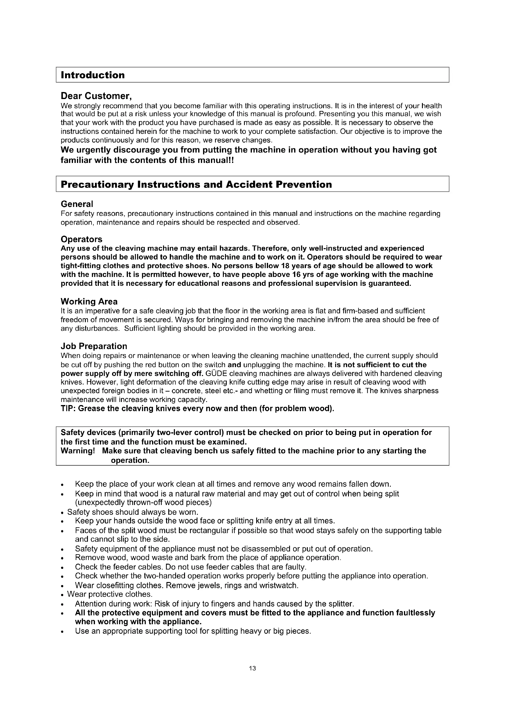 When doing repairs or maintenance or when leaving the cleaning machine unattended, the current supply should be cut off by pushing the red button on the switch and unplugging the machine. It is not sufficient to cut the power supply off by mere switching off. GÜDE cleaving machines are always delivered with hardened cleaving knives. However, light deformation of the cleaving knife cutting edge may arise in result of cleaving wood with unexpected foreign bodies in it – concrete, steel etc.- and whetting or filing must remove it. The knives sharpness maintenance will increase working capacity.