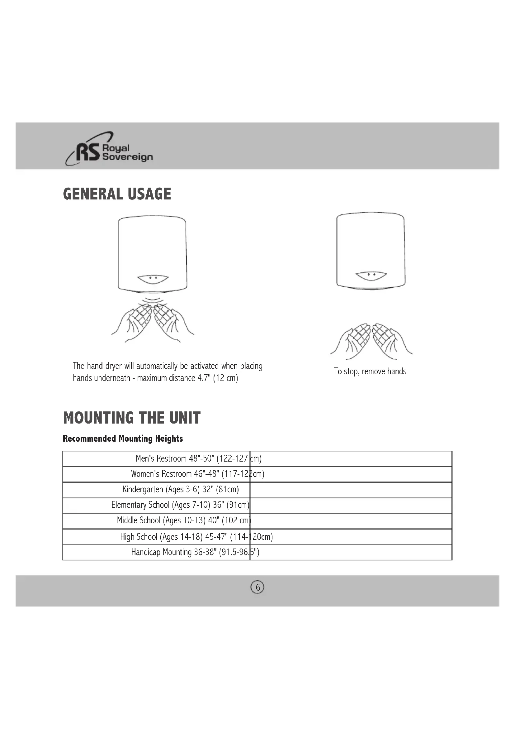 Royal Sovereign International, Inc. RTHD-421S TOUCHLESS AUTOMATIC HAND DRYER Owner's Manual Please read and retain these instructions. Page en Français 13 USA: www.royalsovereign.com Canada: www.royalsovereign.caTOUCHLESS AUTOMATIC HAND DRYER IN TRODUCTION Thank you for choosing Royal Sovereign Touchless Automatic Hand Dryer. Please read and retain these instructions. This manual will provide you with valuable information necessary for the proper instructions, care and maintenance of your hand dryer. Installation should be done by a qualified electrican. Improper installation, alteration, service and use of this hand dryer can result in serious personal injury or damage to the unit. If you have questions regarding the installation, use or operation of the hand dryer, please call Royal Sovereign customer service. Model RTHD-421S Because our products are subject to continuous improvement, Royal Sovereign reserves the right to modify product design and specifications without notice and without incurring any obligation. E&OEIMPORTANT SAFETY INFORMATION 4 DESCRIPTION 5 GENERAL USAGE 6