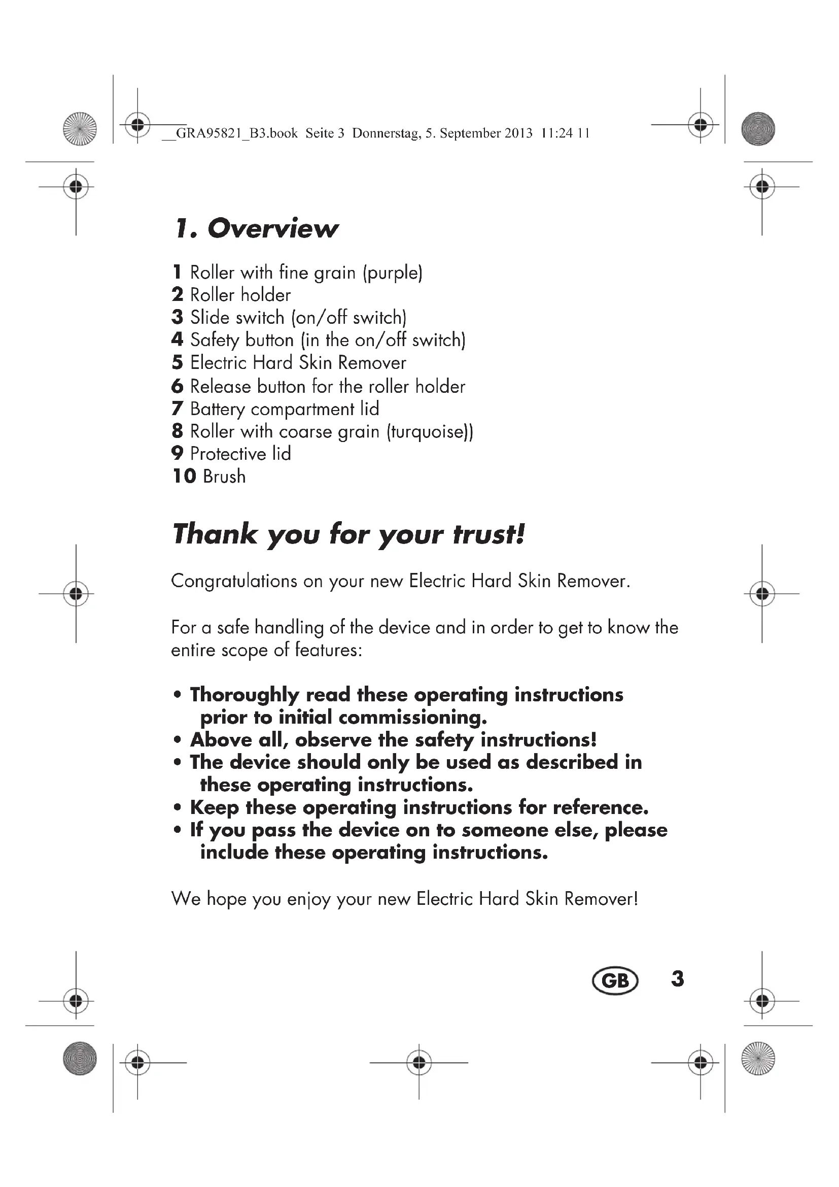 - If you pass the device on to someone else, please include these operating instructions. We hope you enjoy your new Electric Hard Skin Remover! __GRA95821_B3.book Seite 3 Donnerstag, 5. September 2013 11:24 114