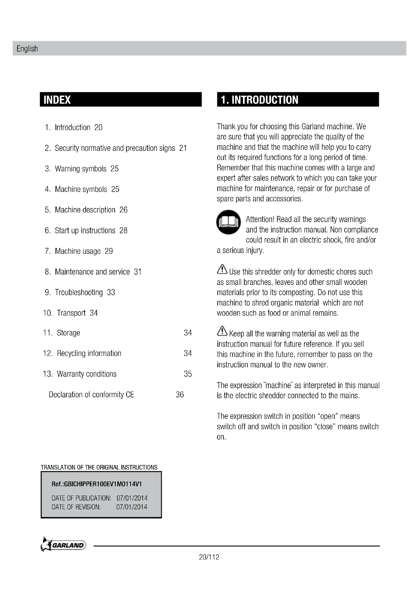 USER MANUAL Chipper 100 E GARLAND