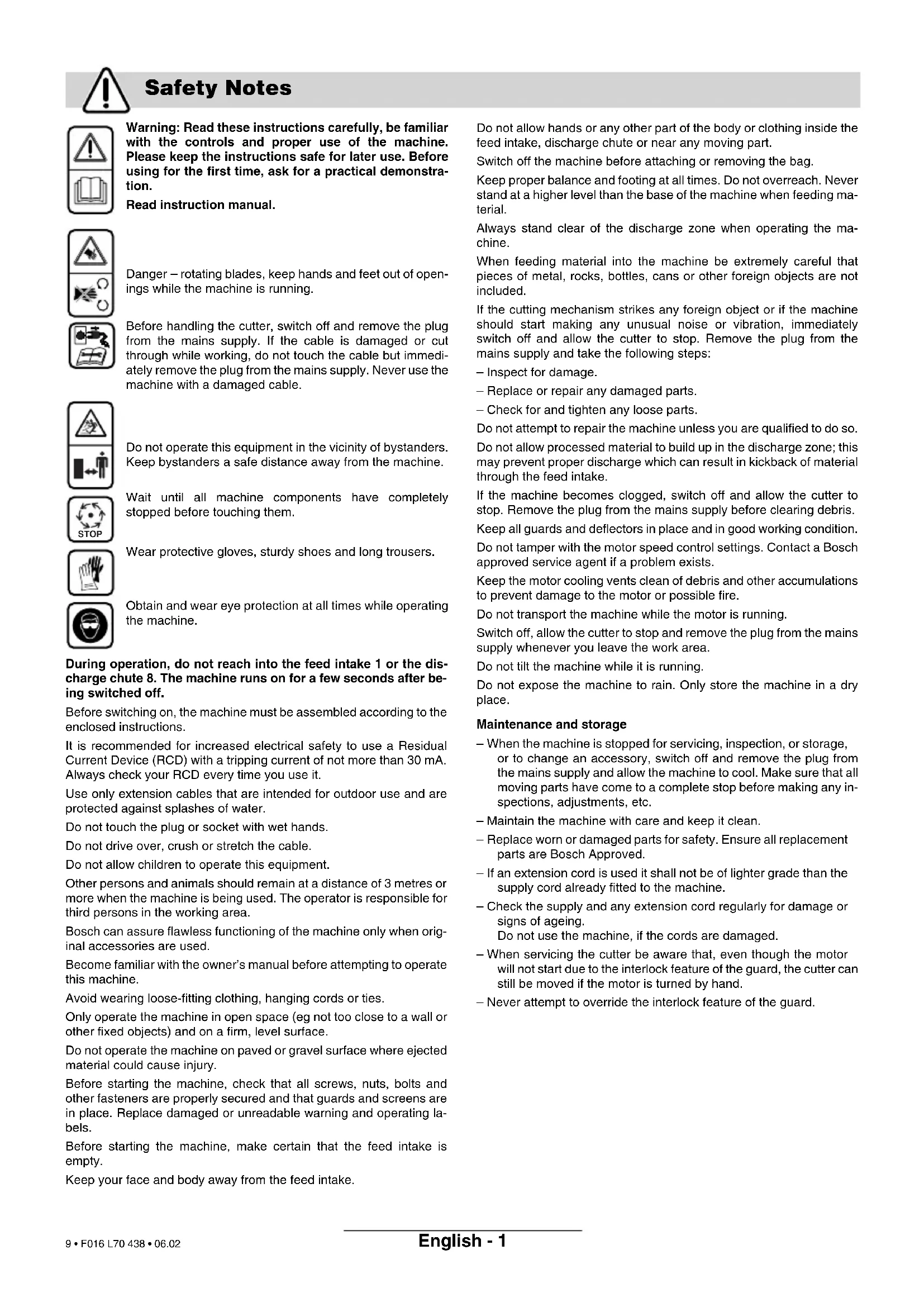 with the controls and proper use of the machine. Please keep the instructions safe for later use. Before using for the first time, ask for a practical demonstra- tion. Read instruction manual. Danger – rotating blades, keep hands and feet out of open- ings while the machine is running. Before handling the cutter, switch off and remove the plug from the mains supply. If the cable is damaged or cut through while working, do not touch the cable but immedi- ately remove the plug from the mains supply. Never use the machine with a damaged cable. Do not operate this equipment in the vicinity of bystanders. Keep bystanders a safe distance away from the machine. Wait until all machine components have completely stopped before touching them. Wear protective gloves, sturdy shoes and long trousers. Obtain and wear eye protection at all times while operating the machine. During operation, do not reach into the feed intake 1 or the dis- charge chute 8. The machine runs on for a few seconds after be- ing switched off. Before switching on, the machine must be assembled according to the enclosed instructions. It is recommended for increased electrical safety to use a Residual Current Device (RCD) with a tripping current of not more than 30 mA. Always check your RCD every time you use it. Use only extension cables that are intended for outdoor use and are protected against splashes of water. Do not touch the plug or socket with wet hands. Do not drive over, crush or stretch the cable. Do not allow children to operate this equipment. Other persons and animals should remain at a distance of 3 metres or more when the machine is being used. The operator is responsible for third persons in the working area. Bosch can assure flawless functioning of the machine only when orig- inal accessories are used. Become familiar with the owner’s manual before attempting to operate this machine. Avoid wearing loose-fitting clothing, hanging cords or ties. Only operate the machine in open space (eg not too close to a wall or other fixed objects) and on a firm, level surface. Do not operate the machine on paved or gravel surface where ejected material could cause injury. Before starting the machine, check that all screws, nuts, bolts and other fasteners are properly secured and that guards and screens are in place. Replace damaged or unreadable warning and operating la- bels. Before starting the machine, make certain that the feed intake is empty. Keep your face and body away from the feed intake. Do not allow hands or any other part of the body or clothing inside the feed intake, discharge chute or near any moving part. Switch off the machine before attaching or removing the bag. Keep proper balance and footing at all times. Do not overreach. Never stand at a higher level than the base of the machine when feeding ma- terial. Always stand clear of the discharge zone when operating the ma- chine. When feeding material into the machine be extremely careful that pieces of metal, rocks, bottles, cans or other foreign objects are not included. If the cutting mechanism strikes any foreign object or if the machine should start making any unusual noise or vibration, immediately switch off and allow the cutter to stop. Remove the plug from the mains supply and take the following steps: – Inspect for damage. – Replace or repair any damaged parts. – Check for and tighten any loose parts. Do not attempt to repair the machine unless you are qualified to do so. Do not allow processed material to build up in the discharge zone; this may prevent proper discharge which can result in kickback of material through the feed intake. If the machine becomes clogged, switch off and allow the cutter to stop. Remove the plug from the mains supply before clearing debris. Keep all guards and deflectors in place and in good working condition. Do not tamper with the motor speed control settings. Contact a Bosch approved service agent if a problem exists. Keep the motor cooling vents clean of debris and other accumulations to prevent damage to the motor or possible fire. Do not transport the machine while the motor is running. Switch off, allow the cutter to stop and remove the plug from the mains supply whenever you leave the work area. Do not tilt the machine while it is running. Do not expose the machine to rain. Only store the machine in a dry place. Maintenance and storage – When the machine is stopped for servicing, inspection, or storage, or to change an accessory, switch off and remove the plug from the mains supply and allow the machine to cool. Make sure that all moving parts have come to a complete stop before making any in- spections, adjustments, etc. – Maintain the machine with care and keep it clean. – Replace worn or damaged parts for safety. Ensure all replacement parts are Bosch Approved. – If an extension cord is used it shall not be of lighter grade than the supply cord already fitted to the machine. – Check the supply and any extension cord regularly for damage or signs of ageing. Do not use the machine, if the cords are damaged. – When servicing the cutter be aware that, even though the motor will not start due to the interlock feature of the guard, the cutter can still be moved if the motor is turned by hand. – Never attempt to override the interlock feature of the guard. Safety Notes STOP F016 L70 438 - book.book Seite 1 Dienstag, 28. Februar 2006 3:26 15 9 • F016 L70 438 • 06.02English - 2