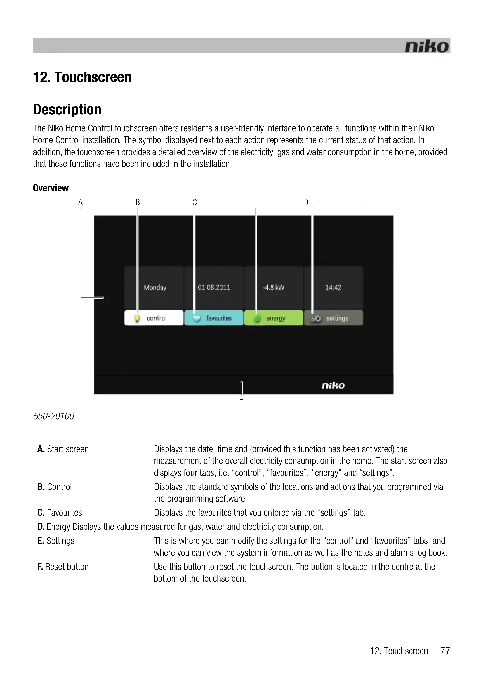 A B C D E Monday 01.08.2011 -4.8 kW 14:42 control favourites energy settings niko F550-20100