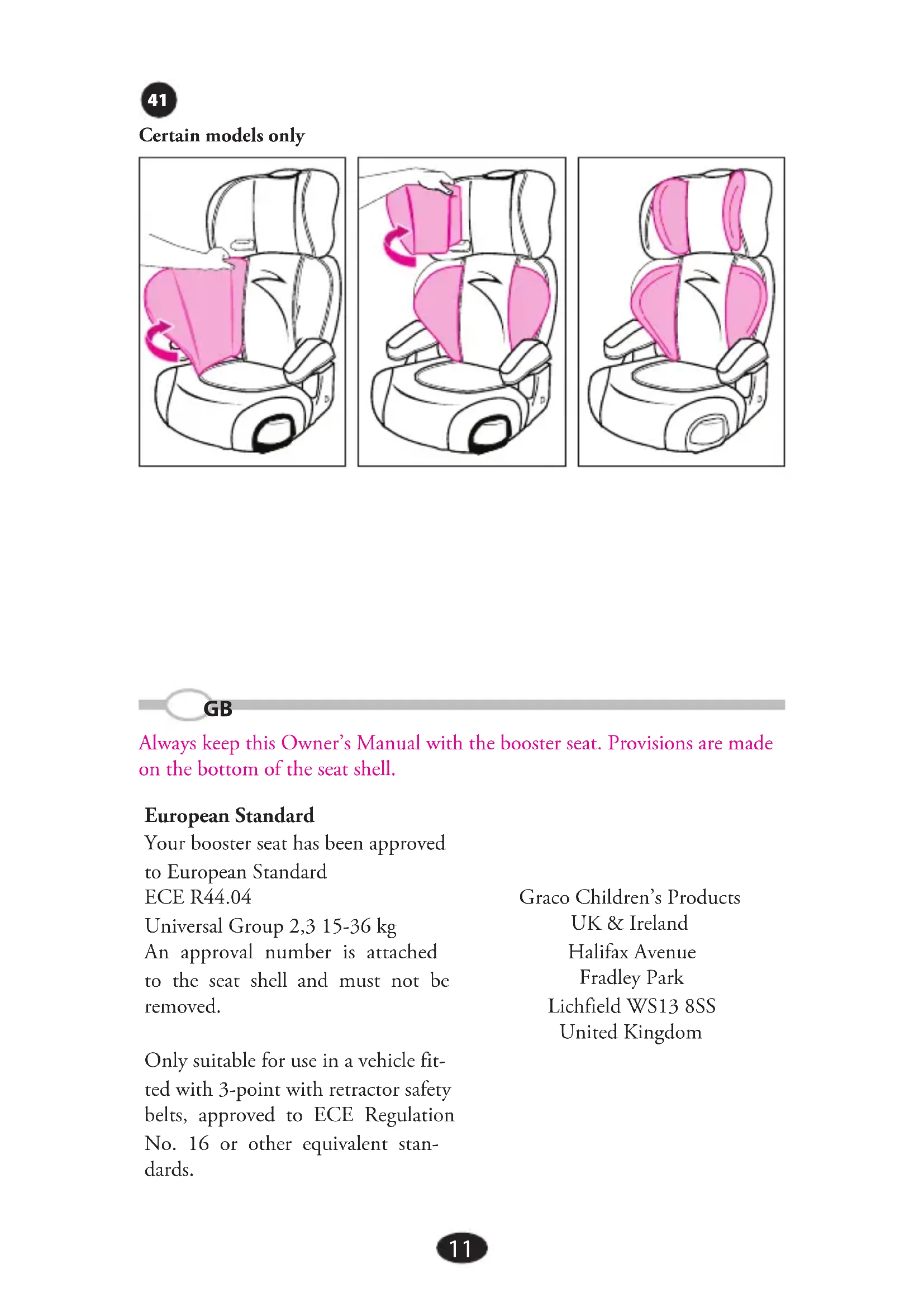 Certain models only European Standard Your booster seat has been approved to European Standard ECE R44.04 Universal Group 2,3 15-36 kg An approval number is attached to the seat shell and must not be removed. Only suitable for use in a vehicle fit- ted with 3-point with retractor safety belts, approved to ECE Regulation No. 16 or other equivalent stan- dards. GBGB Graco Children’s Products UK & Ireland Halifax Avenue Fradley Park Lichfield WS13 8SS United Kingdom Always keep this Owner’s Manual with the booster seat. Provisions are made on the bottom of the seat shell.12 WARNING DO NOT INSTALL OR USE THIS BOOSTER SEAT UNTIL YOU READ AND UNDERSTAND THE INSTRUCTIONS IN THIS MANUAL AND IN YOUR VEHICLE OWNER’S MANUAL. IT IS MOST IMPORTANT that the booster seat is correctly routed with the lap portion of the belt across the red belt guides under the arm- rests and the diagonal belt through the red shoulder belt guides when used with a back support or through the red shoulder belt positioning clip when used as a back-less booster. Ensure the belt web- bing is not twisted. DO TAKE CARE to locate and install the booster seat so that it is not liable to become trapped by a moveable seat or in a door of the vehicle. FAILURE TO PROPERLY USE THIS BOOSTER SEAT INCREASES THE RISK OF SERIOUS INJURY OR DEATH IN A SHARP TURN, SUDDEN STOP OR CRASH. DO NOT use another manufacturers seat cover with this booster seat. See your retailer for Graco replacement parts only. DO NOT USE in any configuration not shown in the instructions. DO NOT use alternative load-bearing points not shown in these instructions. According to accident statistics, CHILDREN ARE SAFER WHEN
