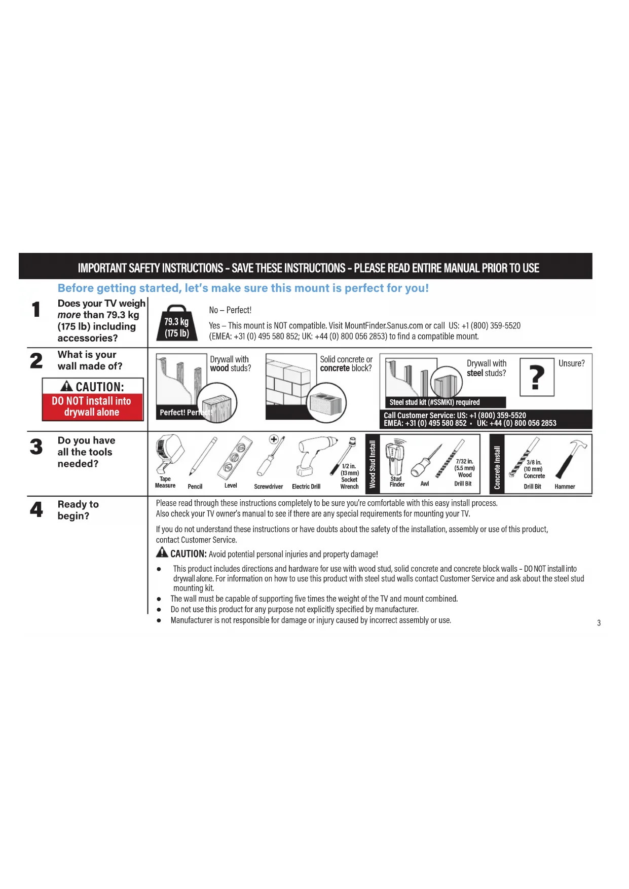 (175 lb) Does your TV weigh more than 79.3 kg (175 lb) including accessories? CAUTION: DO NOT install into drywall alone Drywall with steel studs?Unsure?Call Customer Service: US: +1 (800) 359-5520 EMEA: +31 (0) 495 580 852 • UK: +44 (0) 800 056 2853Steel stud kit (#SSMK1) required Wood Stud Install Concrete Install Pencil Screwdriver Tape Measure 7/32 in. (5.5 mm) Wood Drill Bit Electric Drill Hammer 1/2 in. (13 mm) Socket Wrench Drill Bit 3/8 in. (10 mm) Concrete Awl Stud Finder Level4 STEP 1 Attach Bracket to TV Parts and Hardware for STEP 1 For Concrete Installations ONLY M6 x 35mm M8 x 16mm M8 x 25mm M8 x 35mm M8 x 45mm M8 x 50mm UX10 x 60R CAUTION: Do not use in drywall or wood 5⁄16 in. x 2 3⁄4 in.
