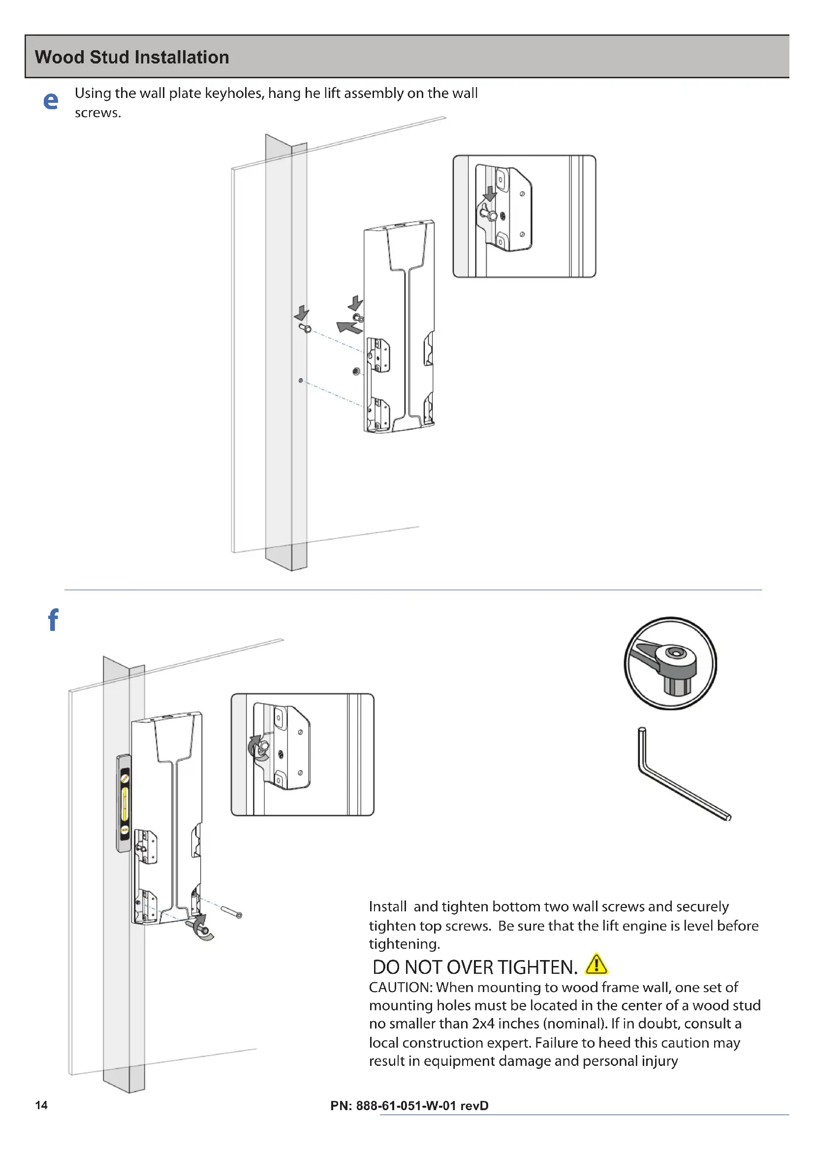 13 mmInstall and tighten bottom two wall screws and securely tighten top screws. Be sure that the lift engine is level before tightening.