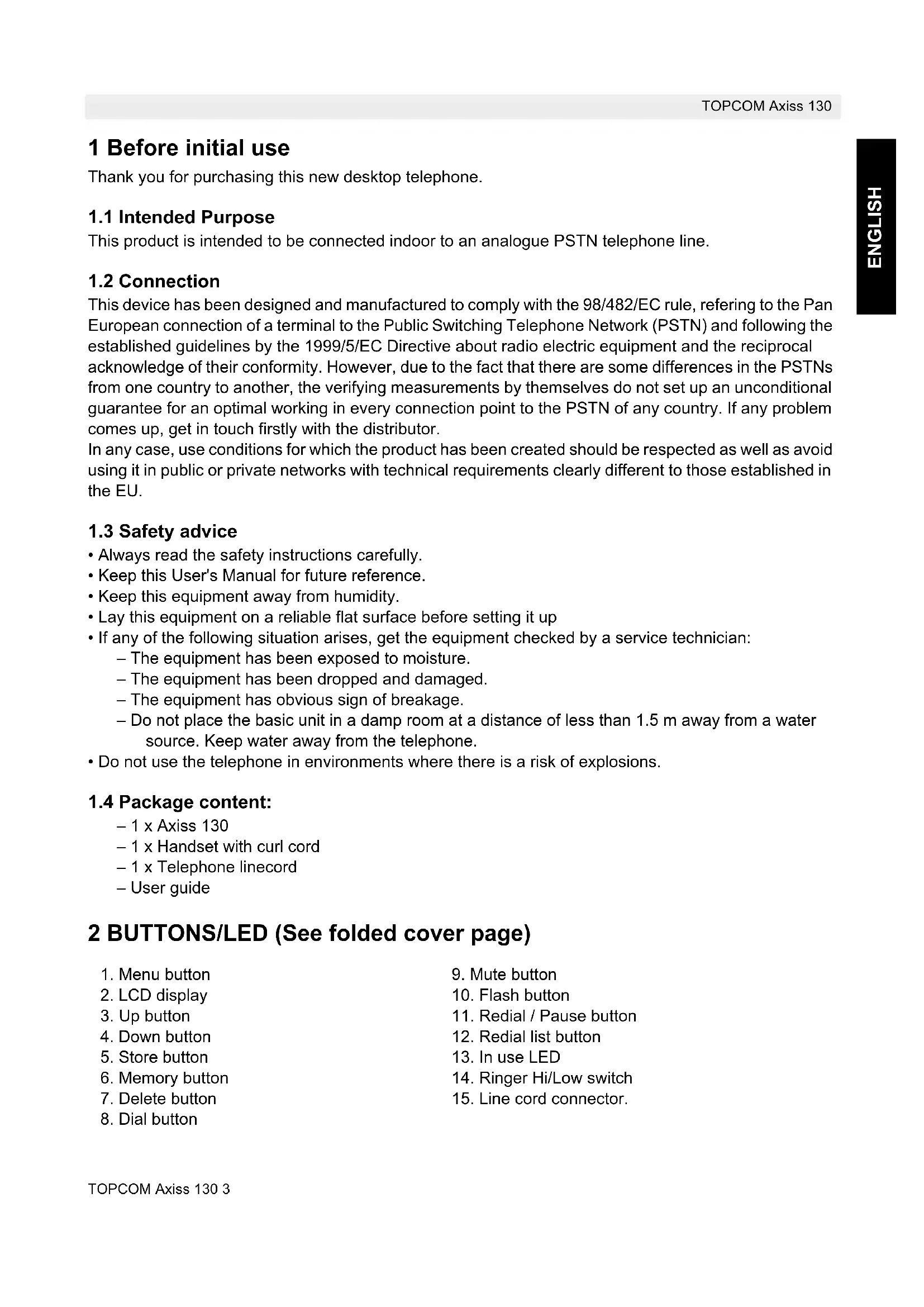 – 1 x Axiss 130 – 1 x Handset with curl cord – 1 x Telephone linecord – User guide 2 BUTTONS/LED (See folded cover page)