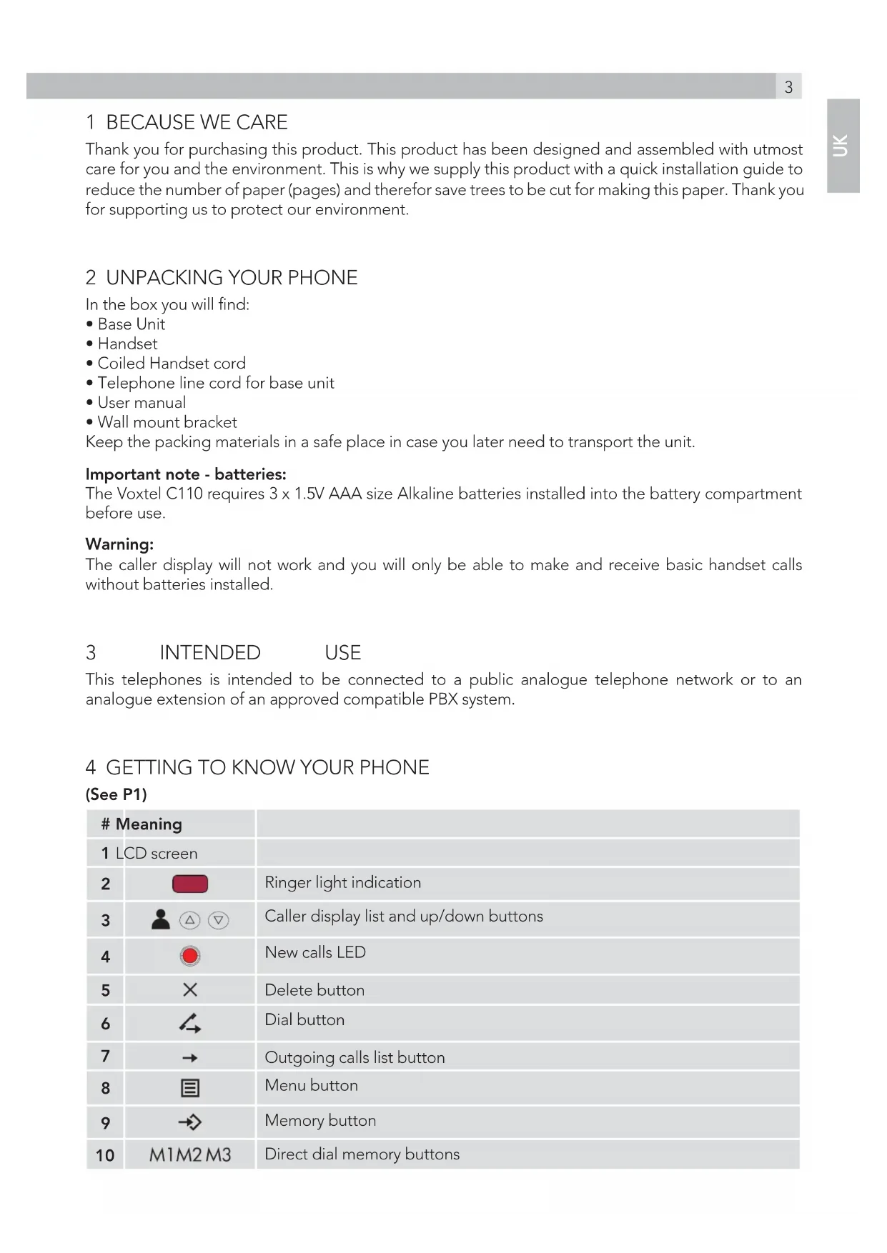 In the box you will find: tBase Unit tHandset tCoiled Handset cord tTelephone line cord for base unit tUser manual tWall mount bracket Keep the packing materials in a safe place in case you later need to transport the unit. Important note - batteries: The Voxtel C110 requires 3 x 1.5V AAA size Alkaline batteries installed into the battery compartment before use.