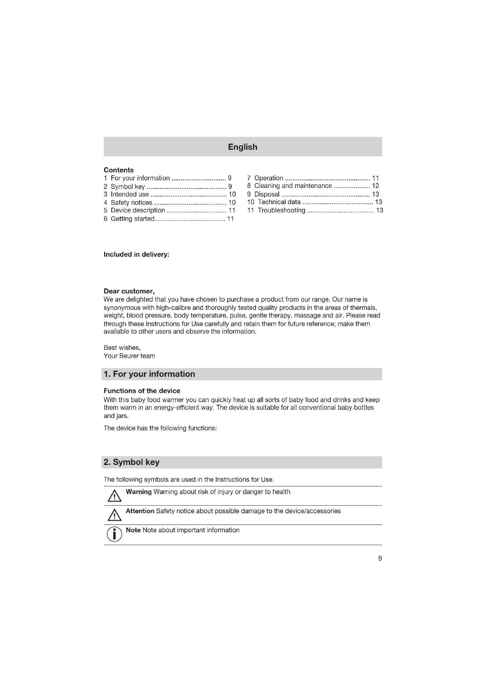 During the warming process, the water becomes hot (risk of scalding).š Check the temperature of the food before the feed (risk of burning).š Keep packaging material away from children (danger of suocation).š The device must only be used on a mains socket with a residual-current protective š device (risk of electric shock). Unplug the mains cable after each usage and before any cleaning (risk of electric š shock). Important: To avoid damage to the device, please observe the following: Fill the device with water before switching it on.š Do not operate the device outside.š The device must only be used on an AC network and with the voltage specified on š the type plate. Do not remove the mains plug from the socket by pulling on the cable!š Do not pull, twist or bend the mains cable.š Never submerge the device in water. Never rinse it in running water.š Do not use any additional parts that are not recommended by the manufacturer or š oered as accessories. General advice Repairs must only be carried out by Customer Services or authorised suppliers. š Do not open or repair the device yourself under any circumstances, otherwise its perfect functioning is no longer guaranteed. Failure to observe this will invalidate the warranty. If you should have any questions about using our devices, please contact either š your retailer or Customer Services.11