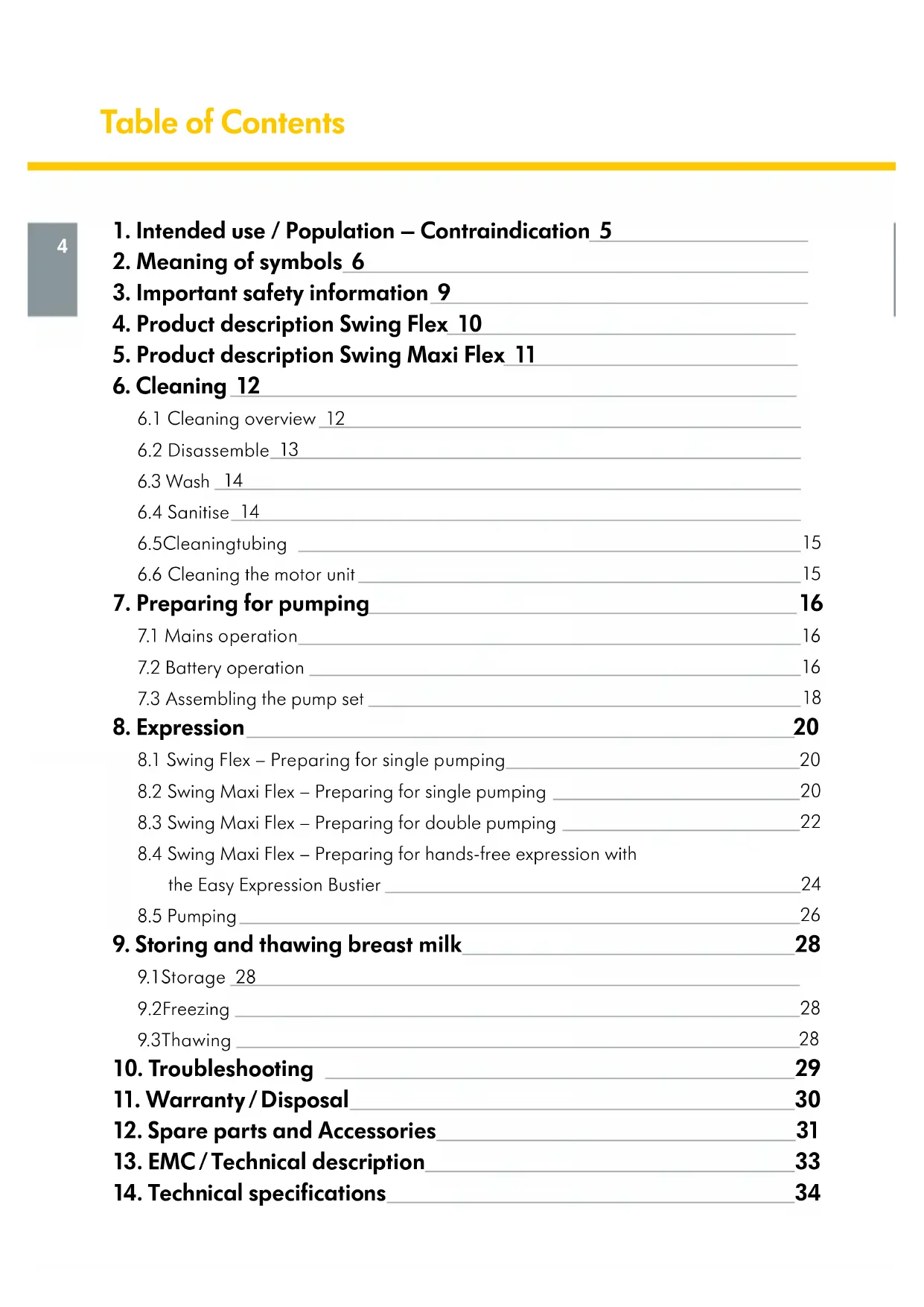 Table of Contents5 The intended use and indications of breast pumps Breast pumps are intended to be used by lactating women in the hospital or home environ- ment for expressing breast milk. Breast pumps are indicated to alleviate the symptoms of engorgement by expressing milk. In case of mastitis breast pumps support the healing process by removing breast milk from the affected breast. Breast pumps are indicated to relieve sore and cracked nipples and to bring out flat or inverted nipples. Also breast pumps enable mothers to provide breast milk for babies who cannot feed directly at the breast for a variety of reasons such as latch-on problems, cleft palate or premature babies. Intended patient population/user Adolescent paediatric or adult lactating women. Many women find it convenient, or even necessary, to use a breast pump to express and store their breast milk once they have returned to work, are travelling or are otherwise separated from their baby. Women are often delighted to learn that a breast pump can be used as a supplement to breastfeeding and that some pumps are designed to mimic the suckling of a nursing baby. Contraindications There are no known contraindications for the Swing Flex / Swing Maxi Flex breast pump.