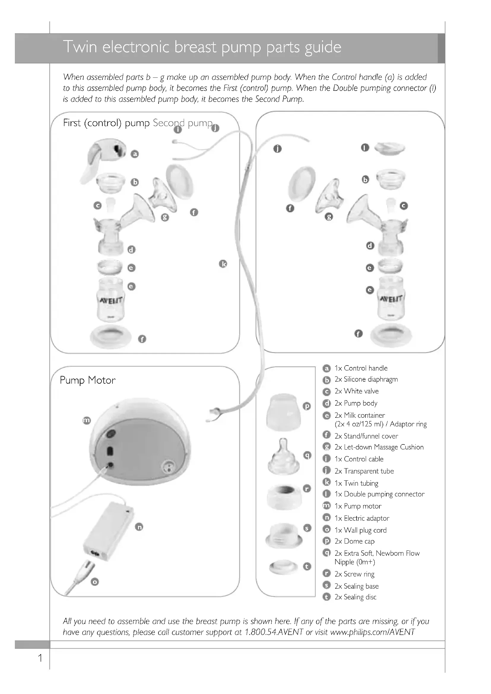 When assembled parts b – g make up an assembled pump body. When the Control handle (a) is added to this assembled pump body, it becomes the First (control) pump. When the Double pumping connector (l) is added to this assembled pump body, it becomes the Second Pump. All you need to assemble and use the breast pump is shown here. If any of the parts are missing, or if you have any questions, please call customer support at 1.800.54.AVENT or visit www.philips.com/AVENT Twin electronic breast pump parts guide e e2 One-touch memory control Control handle Pump motor Light Control cable socket Power socket Twin tubing port Control cable socket Tubing port