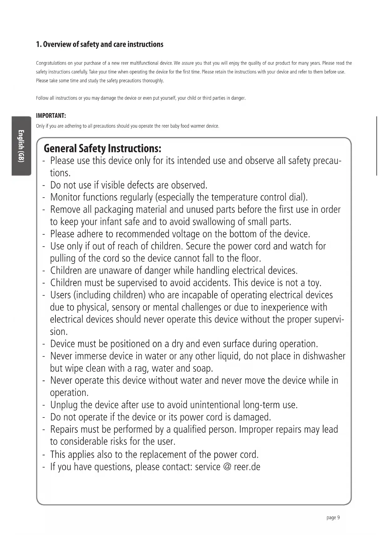 Congratulations on your purchase of a new reer multifunctional device. We assure you that you will enjoy the quality of our product for many years. Please read the safety instructions carefully. Take your time when operating the device for the first time. Please retain the instructions with your device and refer to them before use. Please take some time and study the safety precautions thoroughly.