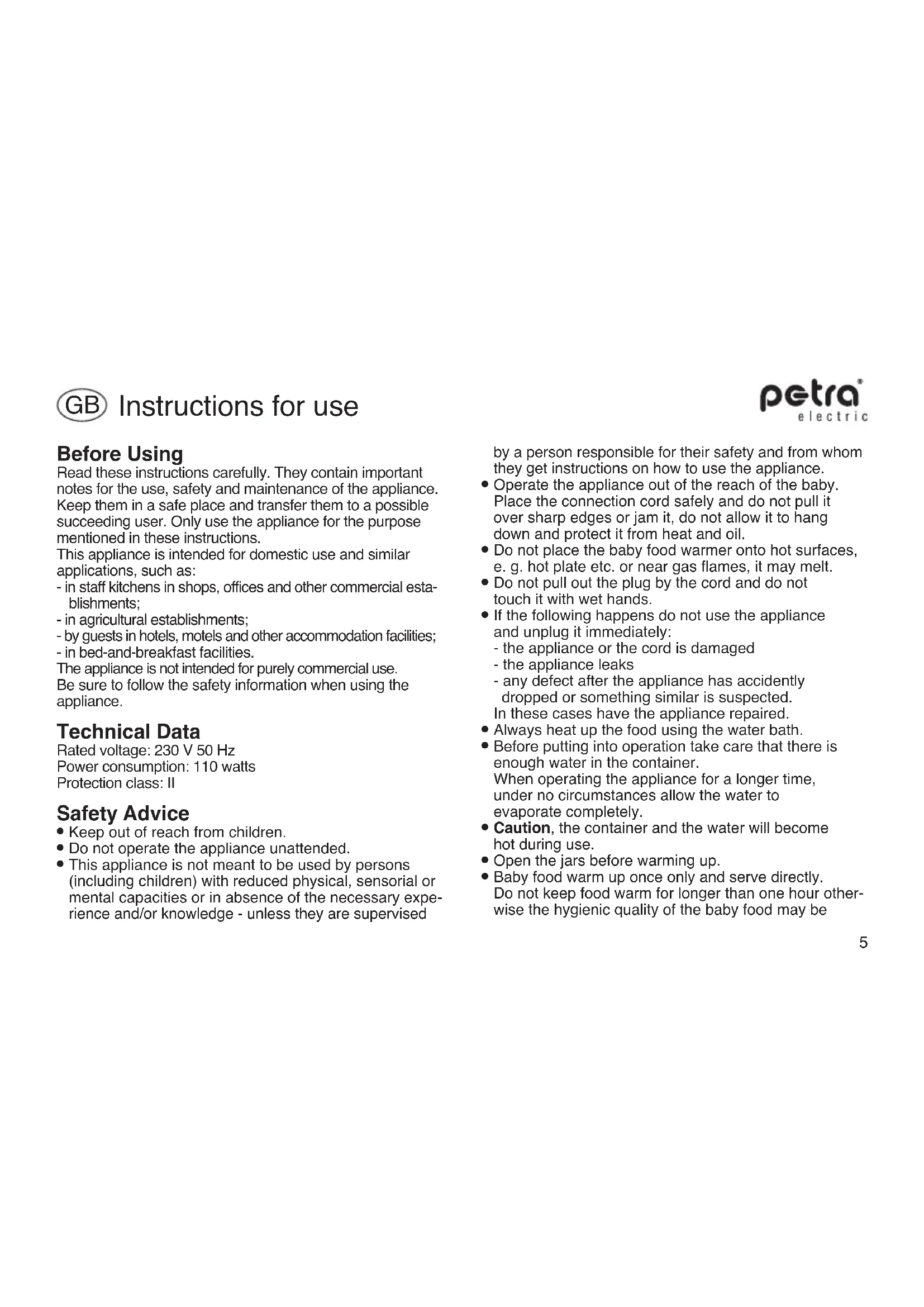 In case the cord of this appliance is damaged, it has to be replacede by an authorised service agent of the manufacturer or a person having similar qualifications. Substantial dangers for the user can appear from inap- propriate repairs. Putting into operation The appliance can be used for a convenient warming up and keeping warm of feeding bottles and all standard sized baby food jars with a diameter of up to 73mm. Prior to use, roll up the not required cord at the botom of the appliance and slide the pointed end of the lifter into the groove in the upper edge of the appliance. To warm up baby food jars, only push the lifter down until the edge of the open glass is just over the appliance. For feeding bottles, push the lifter right down to the bottom. Then fill container with water up to 2 cm below the edge. Comment: Sometimes, the jugs of some manufacturers of baby food might jam when inserting into the appliance. The often reason for this is an non-round jug. Please try to turn the jug a bit - by this normally it fits in slightly. Temperature control The temperature of the water bath can be controlled by the rotary switch. The warming up of the baby food depends on the consistency and composition of the bott- le or the glass. For solid food choose a higher setting of the rotary switch than for liquid food. Full bottles and jars also require a higer setting than for less filled ones. When practising the correct setting can be found quickly. The control lamp shows that the device is heating. It goes out as soon as the water reaches the set tempe- rature. For taking out the food jars, push the lifter a bit upwards. Shake the bottle well or stir the baby food well in order to guarantee equally warm contents. The right temperature should always be checked by holding the baby bottle against the cheek or better by tasting yourself. If the food is to be kept warm for some time, the jar or the bottle should be left in the container. The thermostat guarantees a constant temperature by switching on the heating time after time.7 - the wire which is coloured brown must be connected to the terminal which is marked with the letter L or coloured red.Do not connect any wire to the terminal which is marked with the letter E or by the earth symbol , or coloured green or green and yellow.3. If a 13 A (BS 1363) plug is used it must be fitted with a 3 A fuse conforming to BS 1362 and be ASTA approved. If any other type of plug is used, the appliance must be protected by a 5 A fuse either in the plug or adapter or atthe distribution board.If in doubt - consult a qualified electrician.4. Never use the plug without closing the fuse cover. The appliance complies with the European directives 2006/95/EC, 2004/108/EC and 2005/32/EC. At the end of its lifetime this product must not bedisposed of through the normal domestic waste, butit should be handed to an assembly point for therecycling of electrical and electronical appliances. You caninquire about details at the local administration.Subject to technical changes. Proper dispose of the packaging material. Cleaning and maintenance Before cleaning always unplug the appliance and pour out the remaining water. Never immerse the appliance into water. Do not use caustic or scouring cleansing agents. Clean with a damp cloth, if necessary use some washing-up liquid. For UK use only 1. This product is supplied with a 13 A plug conforming to BS 1363 fitted to the mains lead. If the plug is unsuitablefor your socket outlets or needs to be replaced, please note the following. If the plug is a non-rewireable one, cut it from the mains lead and immediately dispose of it. Never insert it into a socket outlet as there is a very great risk of an electric shock.2. The replacement of the plug at the mains lead has to be done according to the following instructions:Important: The wires in this mains lead are coloured in accordance with the following code:blue: Neutralbrown: LiveAs the colours of the wires in the mains lead of this appliance may not correspond with the coloured markings identifying the terminals in your plug, proceed as follows:- the wire which is coloured blue must be connected to the terminal which is marked with the letter N or coloured black, CE8 Avant usage Lire attentivement le mode d’emploi. Il comprend des indications importantes pour l’utilisation, la sécurité et la maintenance de l’appareil. Il doit être soigneusement conservé et remis le cas échéant à des utilisateurs ultérieurs. L’appareil ne doit être utilisé que pour la destination prévue conformément à ce mode d’emploi. Cet appareil est destiné à des utilisations dome- stiques et comparables comme par exemple : - dans les cuisines pour les collaborateurs dans les commerces, les bureaux et d’autres domaines pro- fessionnels; - dans les domaines agricoles; - par les clients des hôtels, motels et autres services résidentiels; - dans les gîtes avec petit déjeuner. L’appareil n’est pas destiné à un usage purement commercial. Respecter les consignes de sécurité pour l’utilisation. Spécifications techniques Tension nominale: 230 V 50 Hz Puissance absorbée: 110 W Classe de protection: II Indications de sécurité