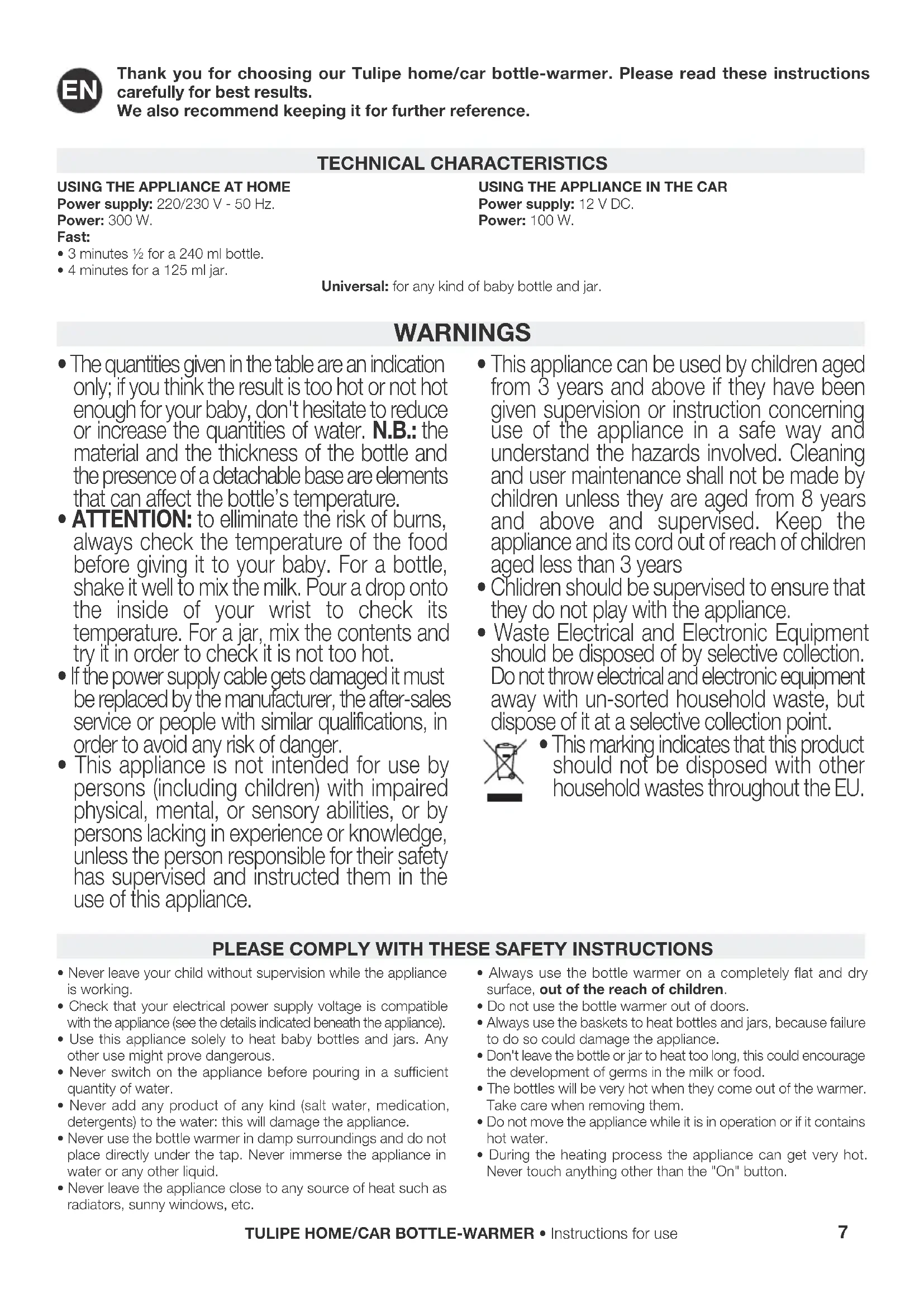 - This marking indicates that this product should not be disposed with other household wastes throughout the EU. TECHNICAL CHARACTERISTICS USING THE APPLIANCE AT HOMEPower supply: 220/230 V - 50 Hz.Power: 300 W.Fast:• 3 minutes ½ for a 240 ml bottle.• 4 minutes for a 125 ml jar.USING THE APPLIANCE IN THE CARPower supply: 12 V DC.Power: 100 W.Universal: for any kind of baby bottle and jar.• Leave the bottle warmer to cool for about 15 minutes before using it again. Never touch the inside of the tank while the appliance is in use, or immediately after use.