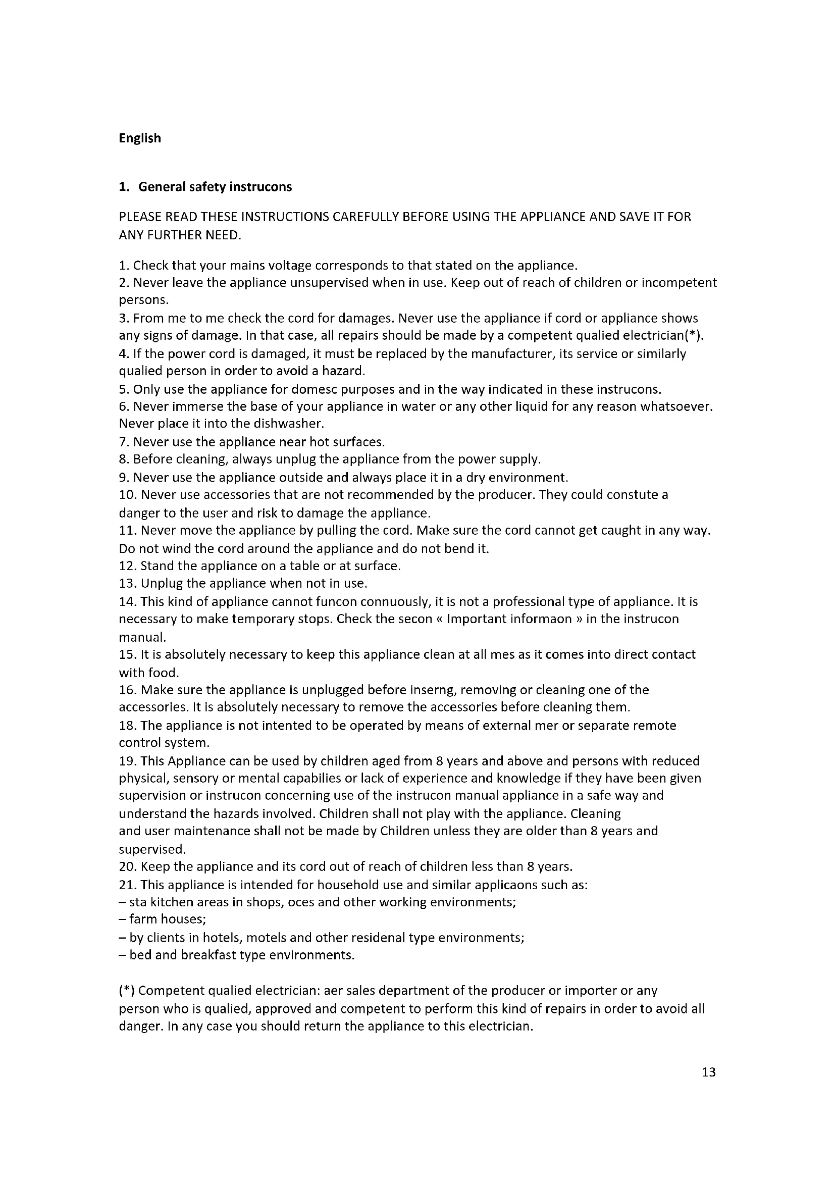 – staff kitchen areas in shops, offices and other working environments; – farm houses; – by clients in hotels, motels and other residential type environments; – bed and breakfast type environments. (*) Competent qualified electrician: after sales department of the producer or importer or any person who is qualified, approved and competent to perform this kind of repairs in order to avoid all danger. In any case you should return the appliance to this electrician.14