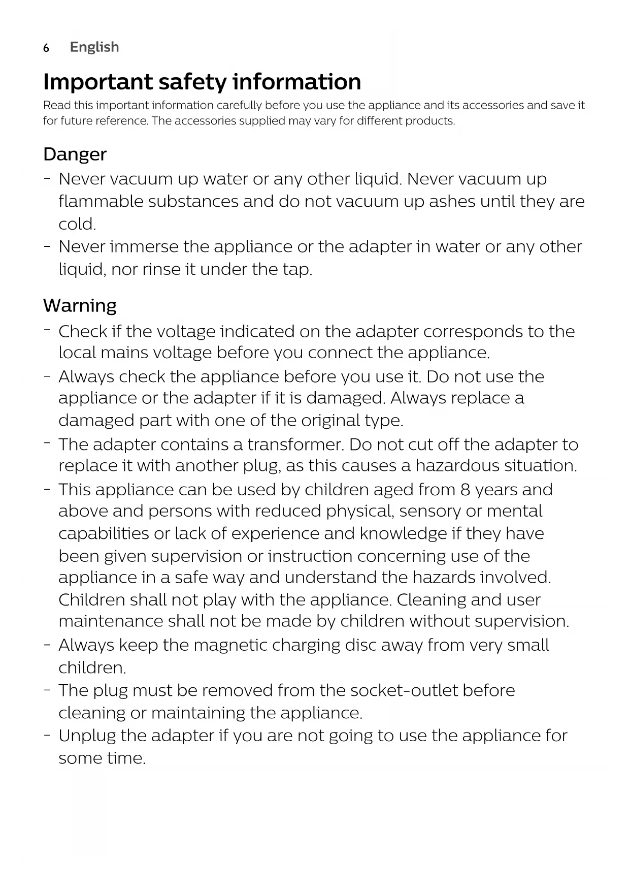107English Important safety information Read this important information carefully before you use the appliance and its accessories and save itfor future reference. The accessories supplied may vary for different products. Danger