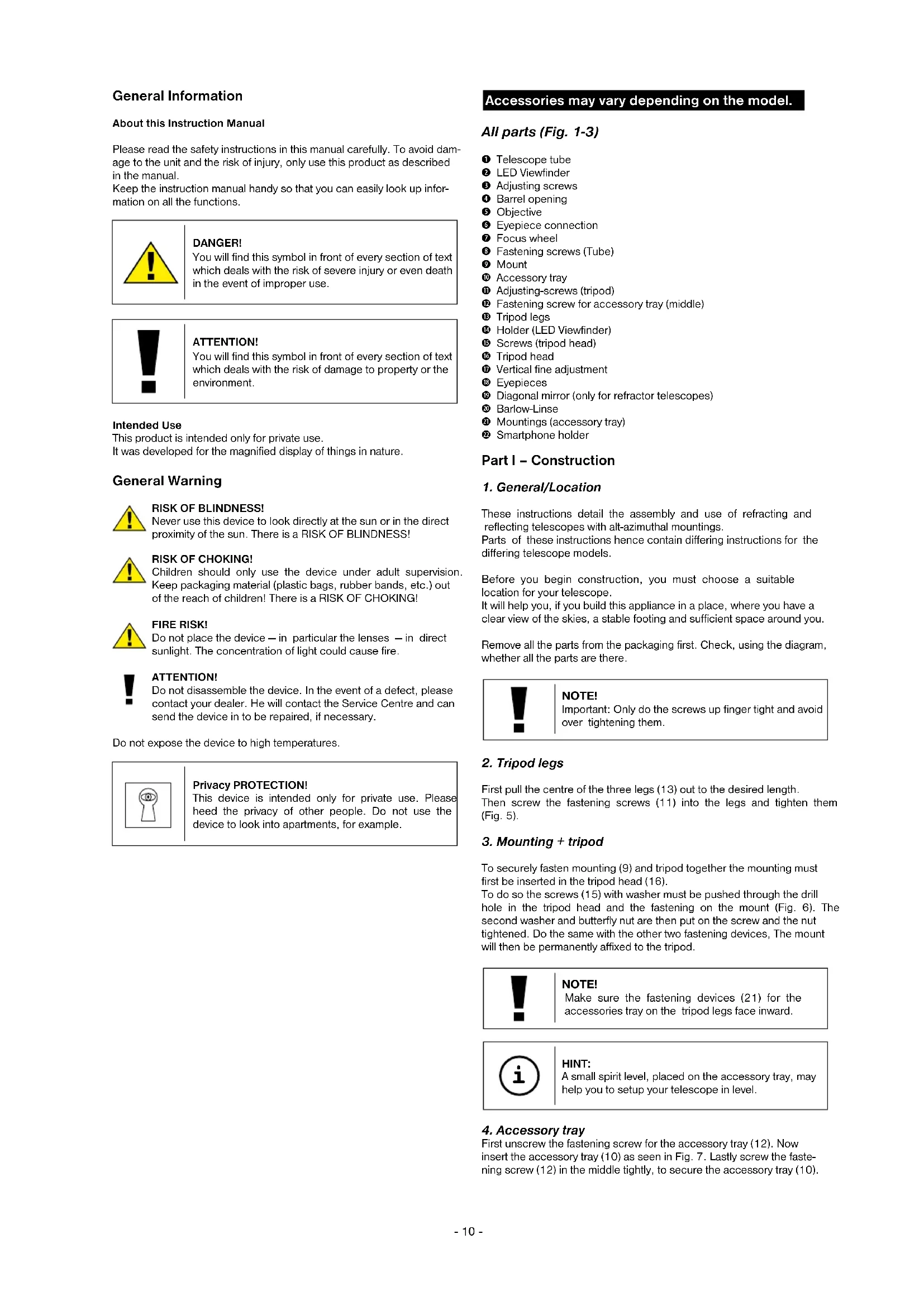These instructions detail the assembly and use of refracting and reflecting telescopes with alt-azimuthal mountings. Parts of these instructions hence contain differing instructions for the differing telescope models. Before you begin construction, you must choose a suitable location for your telescope. It will help you, if you build this appliance in a place, where you have a clear view of the skies, a stable footing and sufficient space around you. Remove all the parts from the packaging first. Check, using the diagram, whether all the parts are there. NOTE! Important: Only do the screws up finger tight and avoid over tightening them.