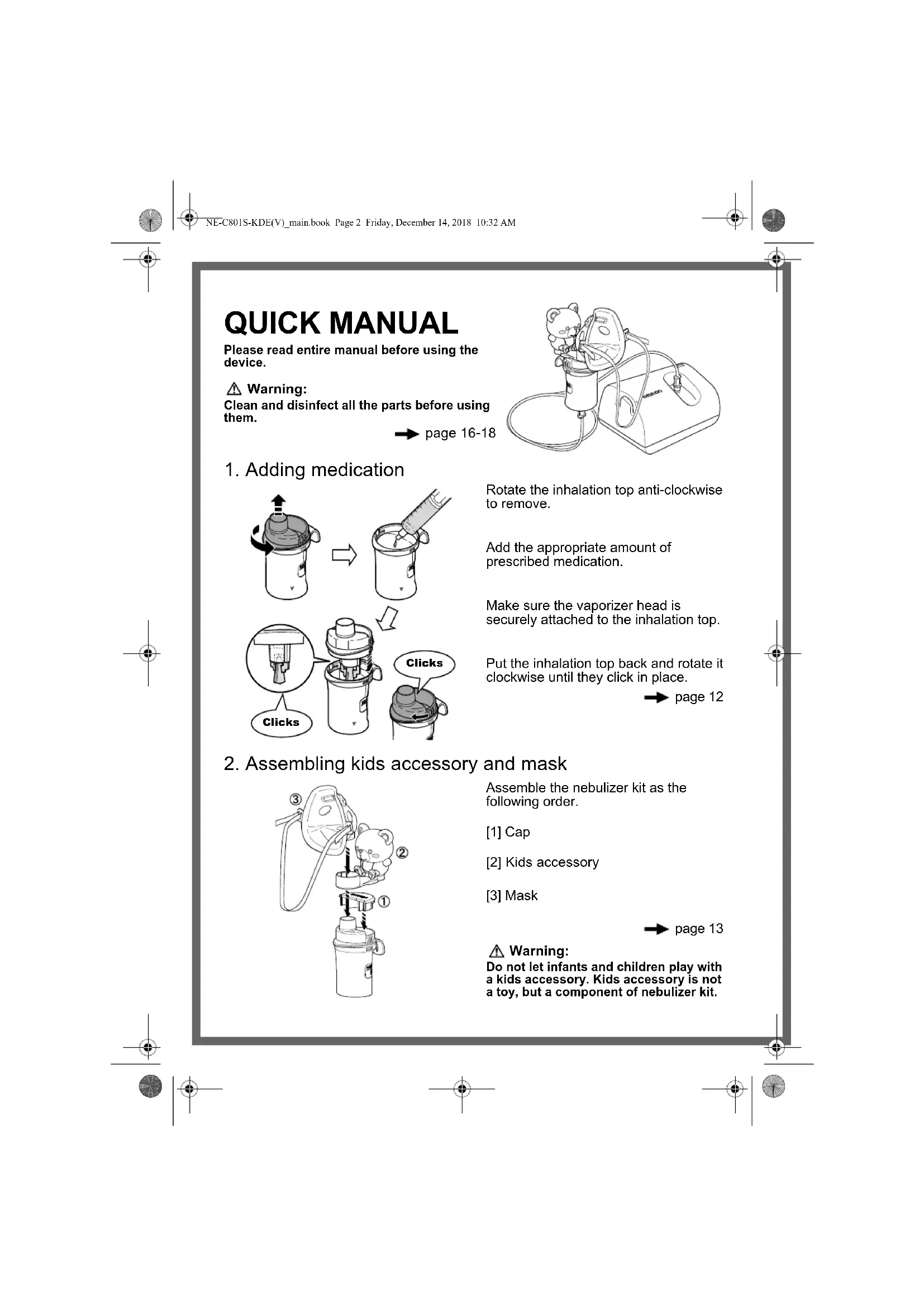 Do not let infants and children play with a kids accessory. Kids accessory is not a toy, but a component of nebulizer kit. Clicks Clicks NE-C801S-KDE(V)_main.book Page 2 Friday, December 14, 2018 10:32 AM3. Connecting AC adapter