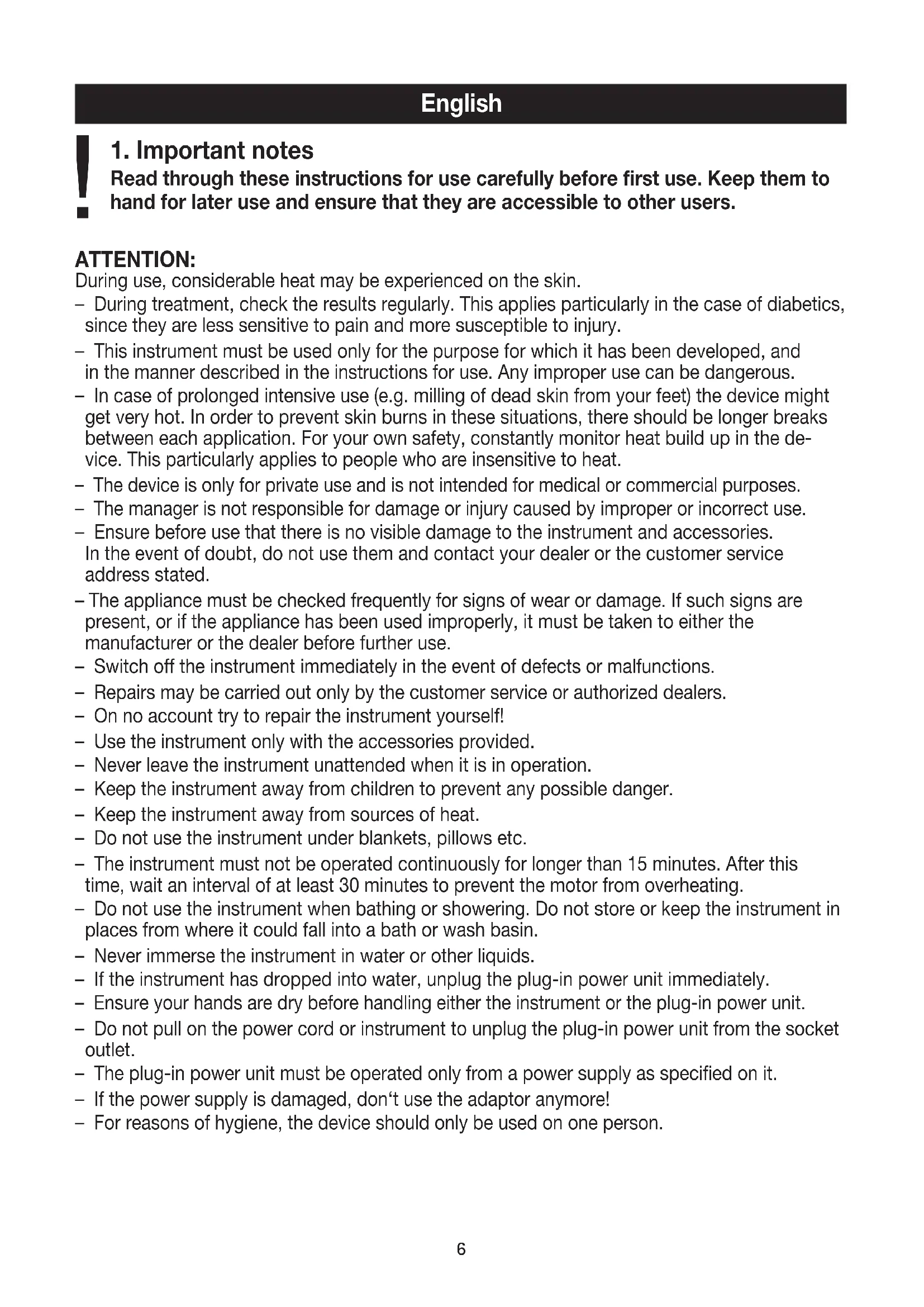 Read through these instructions for use carefully before first use. Keep them to hand for later use and ensure that they are accessible to other users. ATTENTION: During use, considerable heat may be experienced on the skin. – During treatment, check the results regularly. This applies particularly in the case of diabetics, since they are less sensitive to pain and more susceptible to injury. – This instrument must be used only for the purpose for which it has been developed, and in the manner described in the instructions for use. Any improper use can be dangerous. – In case of prolonged intensive use (e.g. milling of dead skin from your feet) the device might get very hot. In order to prevent skin burns in these situations, there should be longer breaks between each application. For your own safety, constantly monitor heat build up in the de- vice. This particularly applies to people who are insensitive to heat. – The device is only for private use and is not intended for medical or commercial purposes. – The manager is not responsible for damage or injury caused by improper or incorrect use. – Ensure before use that there is no visible damage to the instrument and accessories. In the event of doubt, do not use them and contact your dealer or the customer service address stated. – The appliance must be checked frequently for signs of wear or damage. If such signs are present, or if the appliance has been used improperly, it must be taken to either the manufacturer or the dealer before further use. – Switch off the instrument immediately in the event of defects or malfunctions. – Repairs may be carried out only by the customer service or authorized dealers. – On no account try to repair the instrument yourself! – Use the instrument only with the accessories provided. – Never leave the instrument unattended when it is in operation. – Keep the instrument away from children to prevent any possible danger. – Keep the instrument away from sources of heat. – Do not use the instrument under blankets, pillows etc. – The instrument must not be operated continuously for longer than 15 minutes. After this time, wait an interval of at least 30 minutes to prevent the motor from overheating. – Do not use the instrument when bathing or showering. Do not store or keep the instrument in places from where it could fall into a bath or wash basin. – Never immerse the instrument in water or other liquids. – If the instrument has dropped into water, unplug the plug-in power unit immediately. – Ensure your hands are dry before handling either the instrument or the plug-in power unit. – Do not pull on the power cord or instrument to unplug the plug-in power unit from the socket outlet. – The plug-in power unit must be operated only from a power supply as specified on it. – If the power supply is damaged, don‘t use the adaptor anymore! – For reasons of hygiene, the device should only be used on one person. English