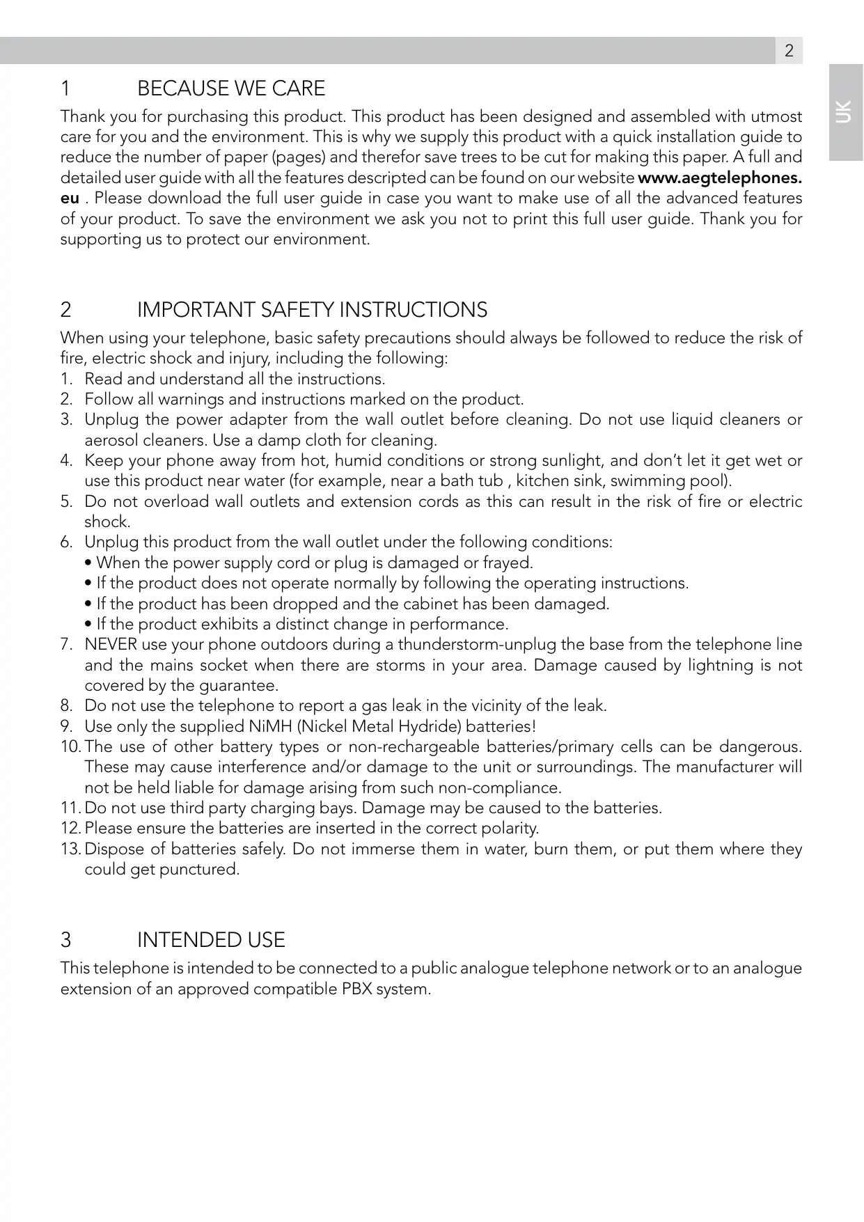 Thank you for purchasing this product. This product has been designed and assembled with utmost care for you and the environment. This is why we supply this product with a quick installation guide to reduce the number of paper (pages) and therefor save trees to be cut for making this paper. A full and detailed user guide with all the features descripted can be found on our website www.aegtelephones. eu . Please download the full user guide in case you want to make use of all the advanced features of your product. To save the environment we ask you not to print this full user guide. Thank you for supporting us to protect our environment.
