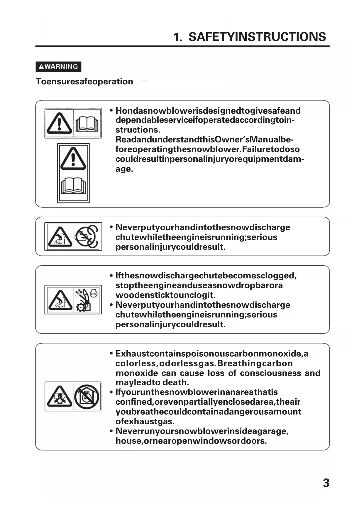 SAFETY INSTRUCTIONS To ensure safe operation Honda snowblower is designed to give safe and dependable service if operated according to in- structions. Read and understand this Owner’s Manual be- fore operating the snowblower. Failure to do so could result in personal injury or equipment dam- age. Never put your hand into the snow discharge chute while the engine is running; serious personal injury could result. If the snow discharge chute becomes clogged, stop the engine and use a snow drop bar or a wooden stick to unclog it. Never put your hand into the snow discharge chute while the engine is running; serious personal injury could result. Never run your snowblower inside a garage, house, or near open windows or doors. If you run the snowblower in an area that is confined, or even partially enclosed area, the air you breathe could contain a dangerous amount of exhaust gas. Exhaust contains poisonous carbon monoxide, a colorless, od orless gas. Breathing carbon monoxide can cause loss of consciousness and may lead to death.