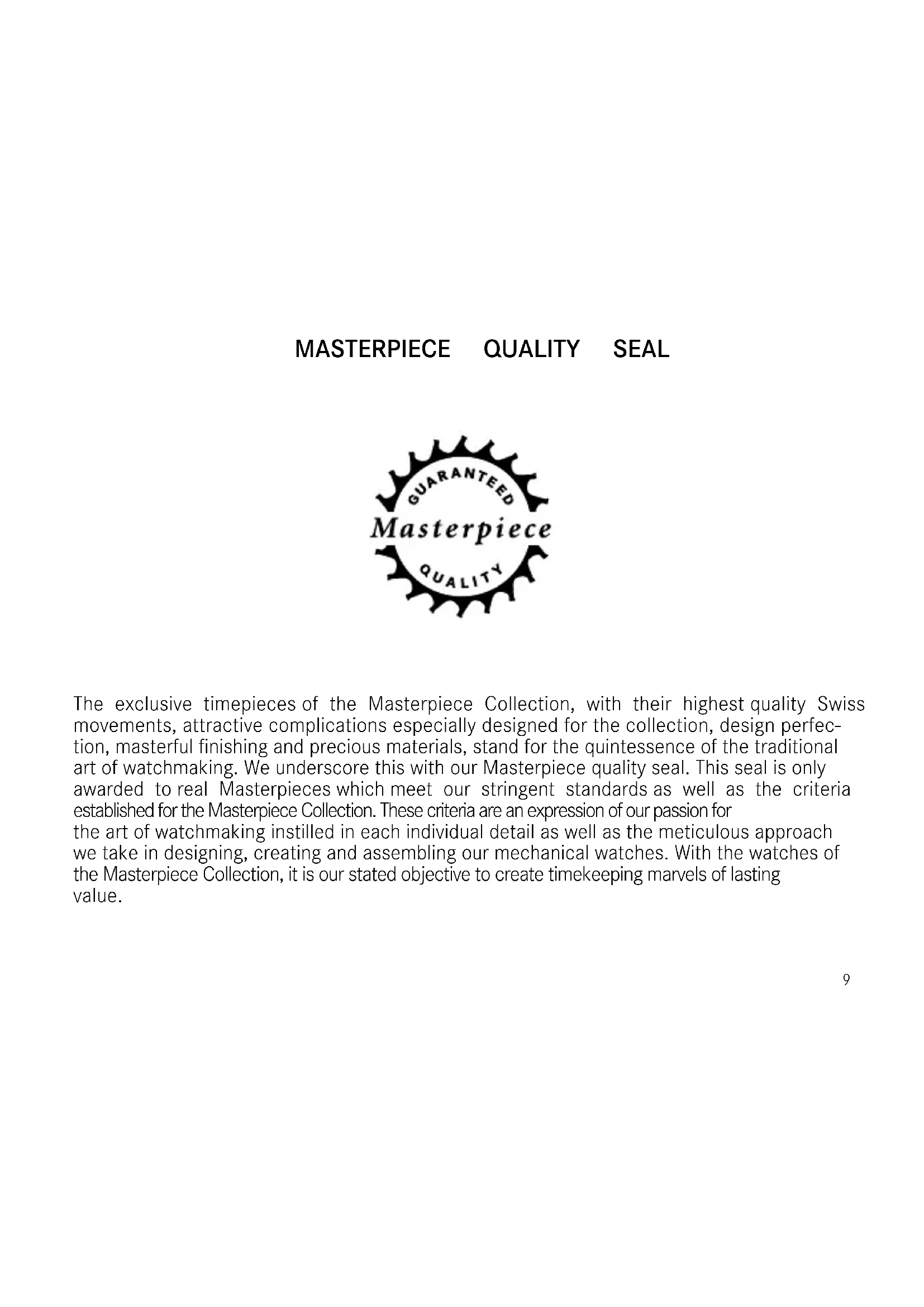 ΏέΎϘϋ ϞΠδϣ ΔΛϼΜϟ ΖϗϮϟ ΩϮόΗϊοϮϟ ήϔμϟ ϳϲϠϳ Ύϣ ΔψΣϼϣ ϰΟή: *ΓϮτΨϟ ΪόΑ )3 ( ϦϜϤϳ ϯήΧ ΔϴϨϣί ΕήΘϓ ςΒοϊϓΪϟ έί ϰϠϋ ςϐπϟΎΑ B )ΓήΘϔϟ νήϋ ΔϴϨϣΰϟ / ΖϗϮϟ ΪϳΪΤΗˬ(.....89 The exclusive timepieces of the Masterpiece Collection, with their highest quality Swiss movements, attractive complications especially designed for the collection, design perfec- tion, masterful nishing and precious materials, stand for the quintessence of the traditional art of watchmaking. We underscore this with our Masterpiece quality seal. This seal is only awarded to real Masterpieces which meet our stringent standards as well as the criteria established for the Masterpiece Collection. These criteria are an expression of our passion for the art of watchmaking instilled in each individual detail as well as the meticulous approach we take in designing, creating and assembling our mechanical watches. With the watches of the Masterpiece Collection, it is our stated objective to create timekeeping marvels of lasting value. Masterpiece quality seal10 criteria for a Masterpiece watch