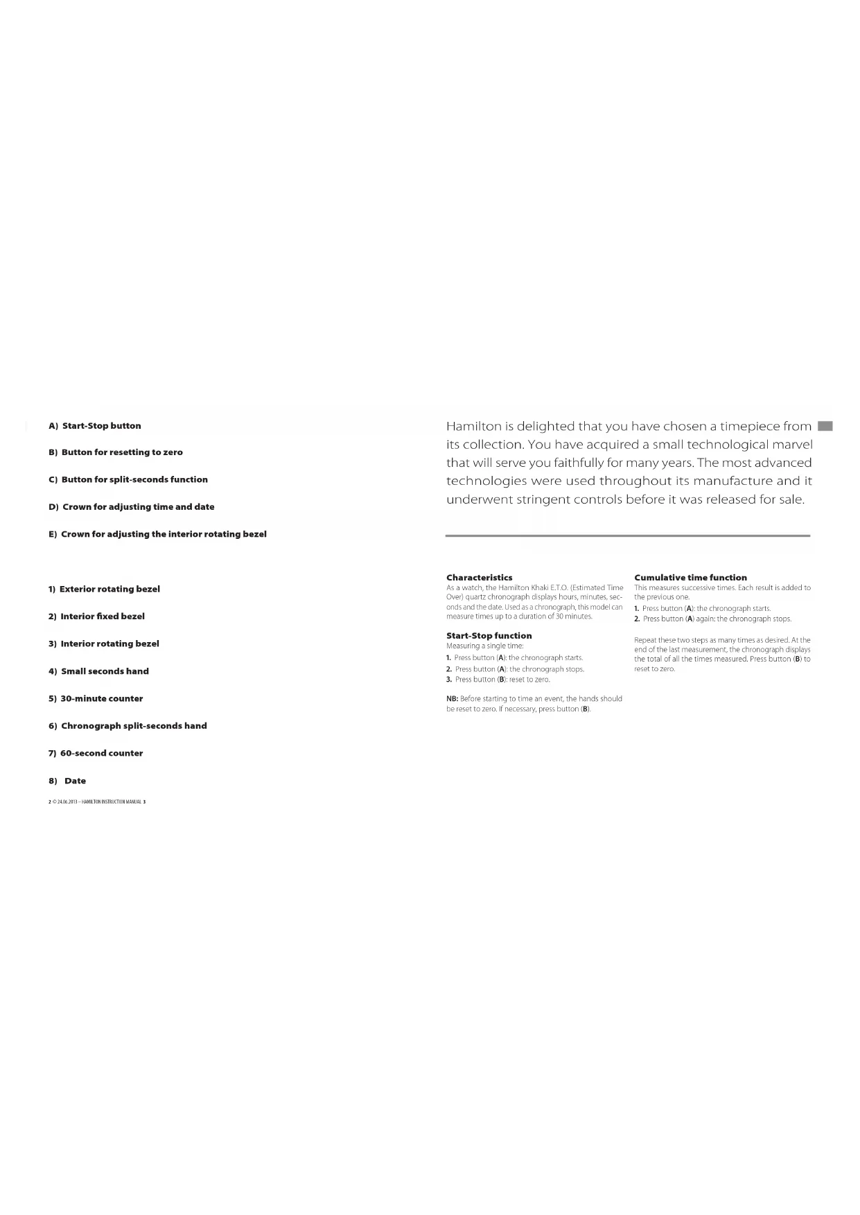 Hamilton is delighted that you have chosen a timepiece from its collection. You have acquired a small technological marvel that will serve you faithfully for many years. The most advanced technologies were used throughout its manufacture and it underwent stringent controls before it was released for sale. Characteristics As a watch, the Hamilton Khaki E.T.O. (Estimated Time Over) quartz chronograph displays hours, minutes, sec- onds and the date. Used as a chronograph, this model can measure times up to a duration of 30 minutes. Start-Stop function Measuring a single time: