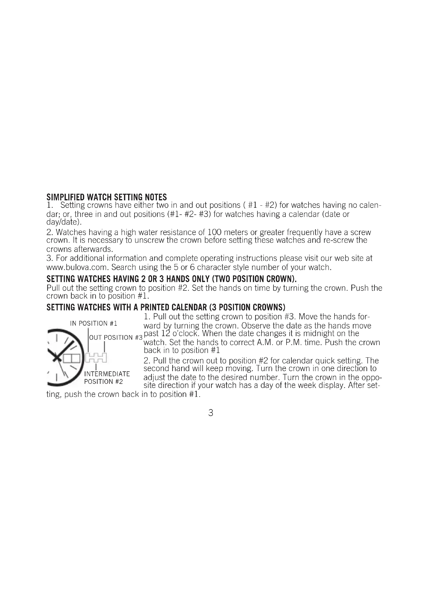 - Setting crowns have either two in and out positions (#1 - #2) for watches having no calendar; or, three in and out positions (#1- #2- #3) for watches having a calendar (date or day/date).