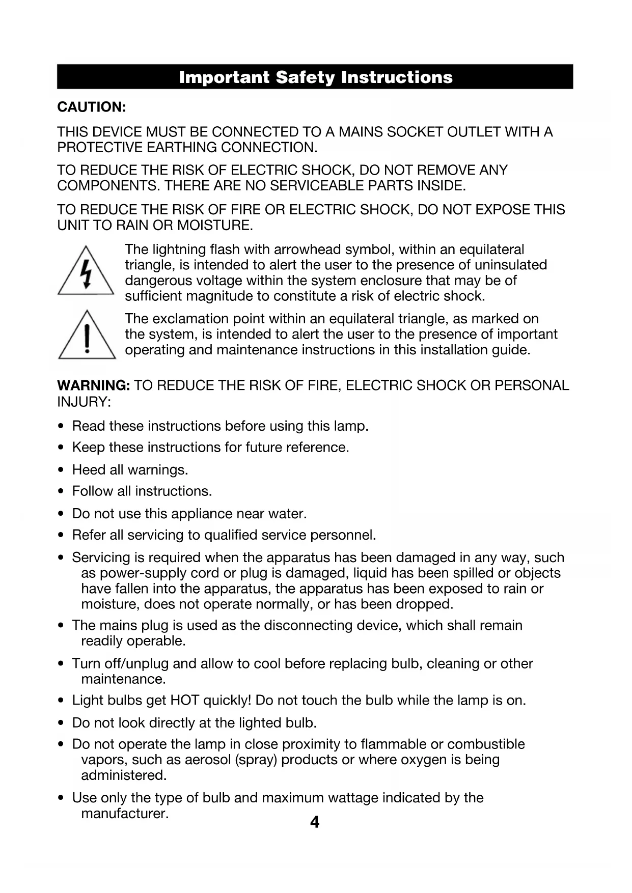 - Turn off/unplug and allow to cool before replacing bulb, cleaning or other maintenance.