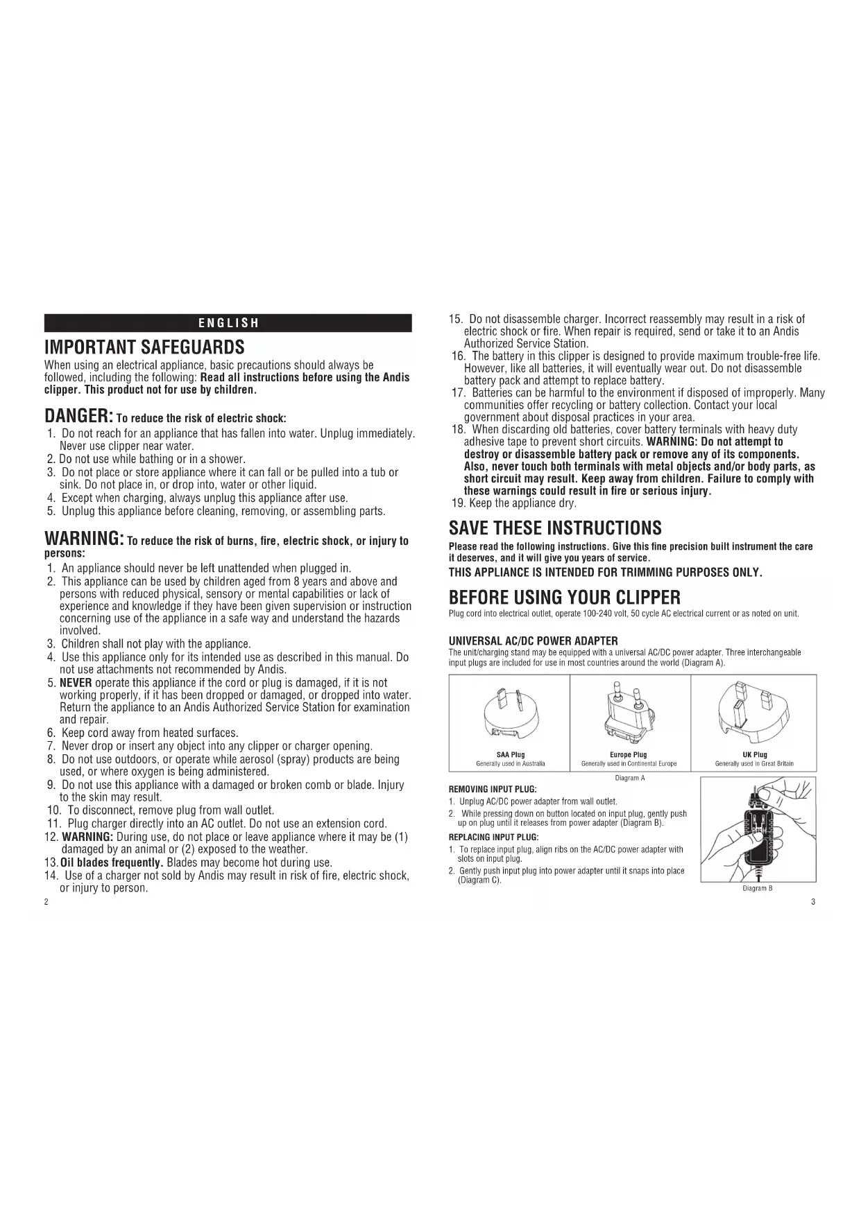 When using an electrical appliance, basic precautions should always be followed, including the following: Read all instructions before using the Andis clipper. This product not for use by children.