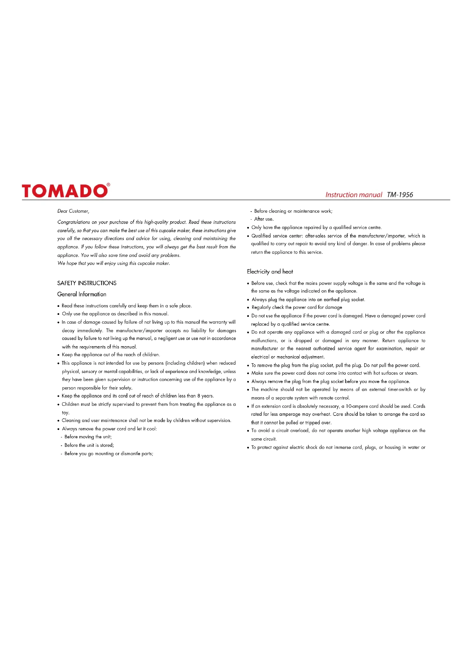 Download the instructions for your Cupcake maker in PDF format for free! Find your manual TM1956 - Tomado and take your electronic device back in hand. On this page are published all the documents necessary for the use of your device. TM1956 by Tomado.